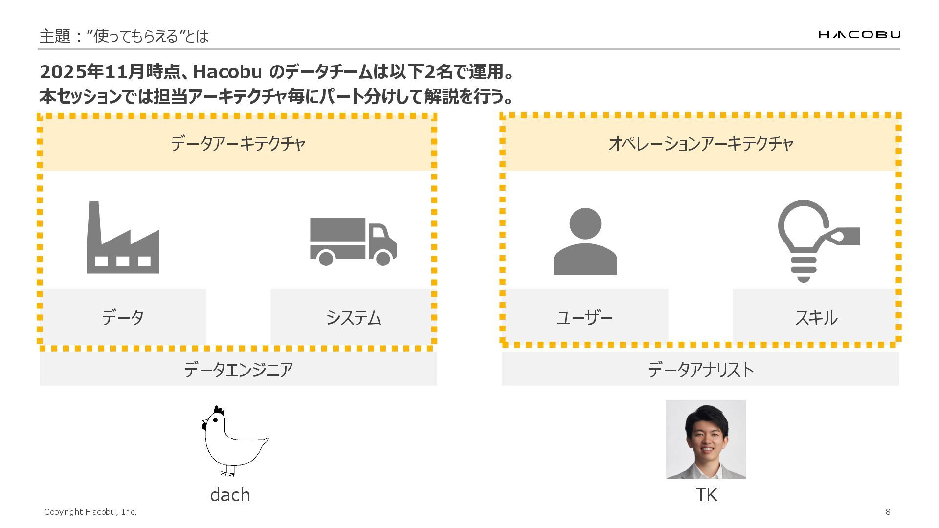 Copyright Hacobu, Inc. 8 主題:”使ってもらえる”とは 2025年11月時点、Hacobu のデータチームは以下2名で運用。 本セッションでは担当アーキテクチャ毎にパート分けして解説を行う。 データエンジニア データアナリスト