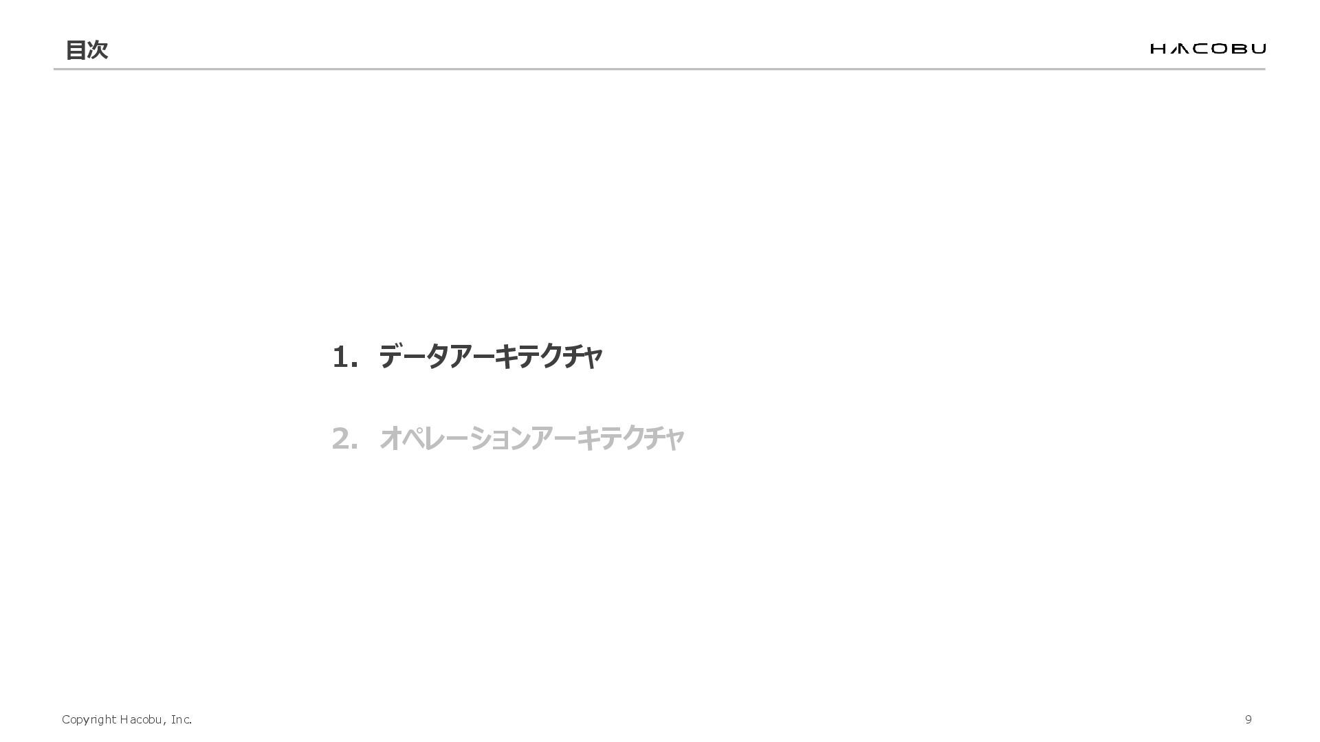 目次 Copyright Hacobu, Inc. 9 1. データアーキテクチャ 2. オペレーションアーキテクチャ