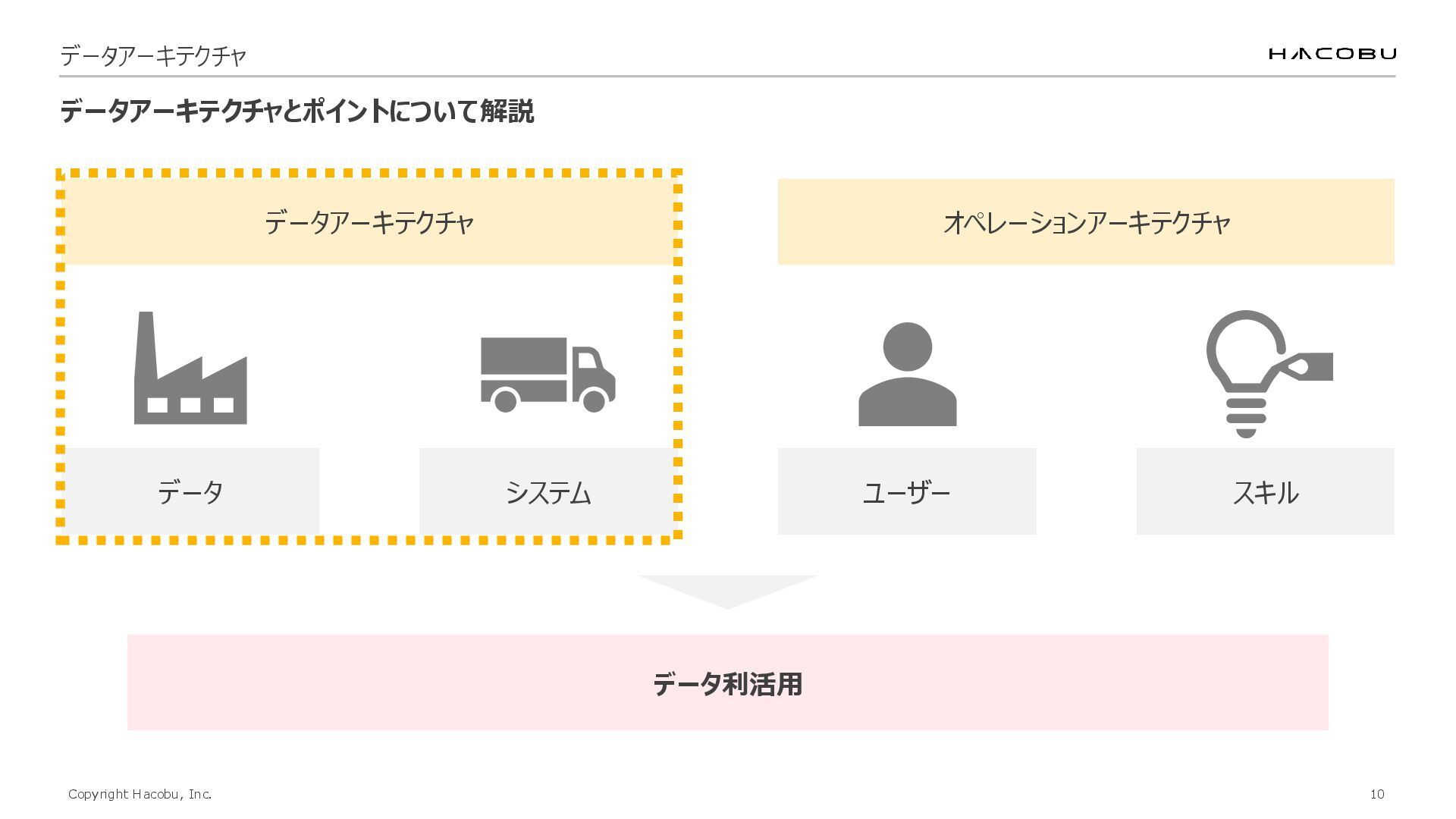 Copyright Hacobu, Inc. 10 データアーキテクチャ データアーキテクチャとポイントについて解説 データ システム ユーザー スキル