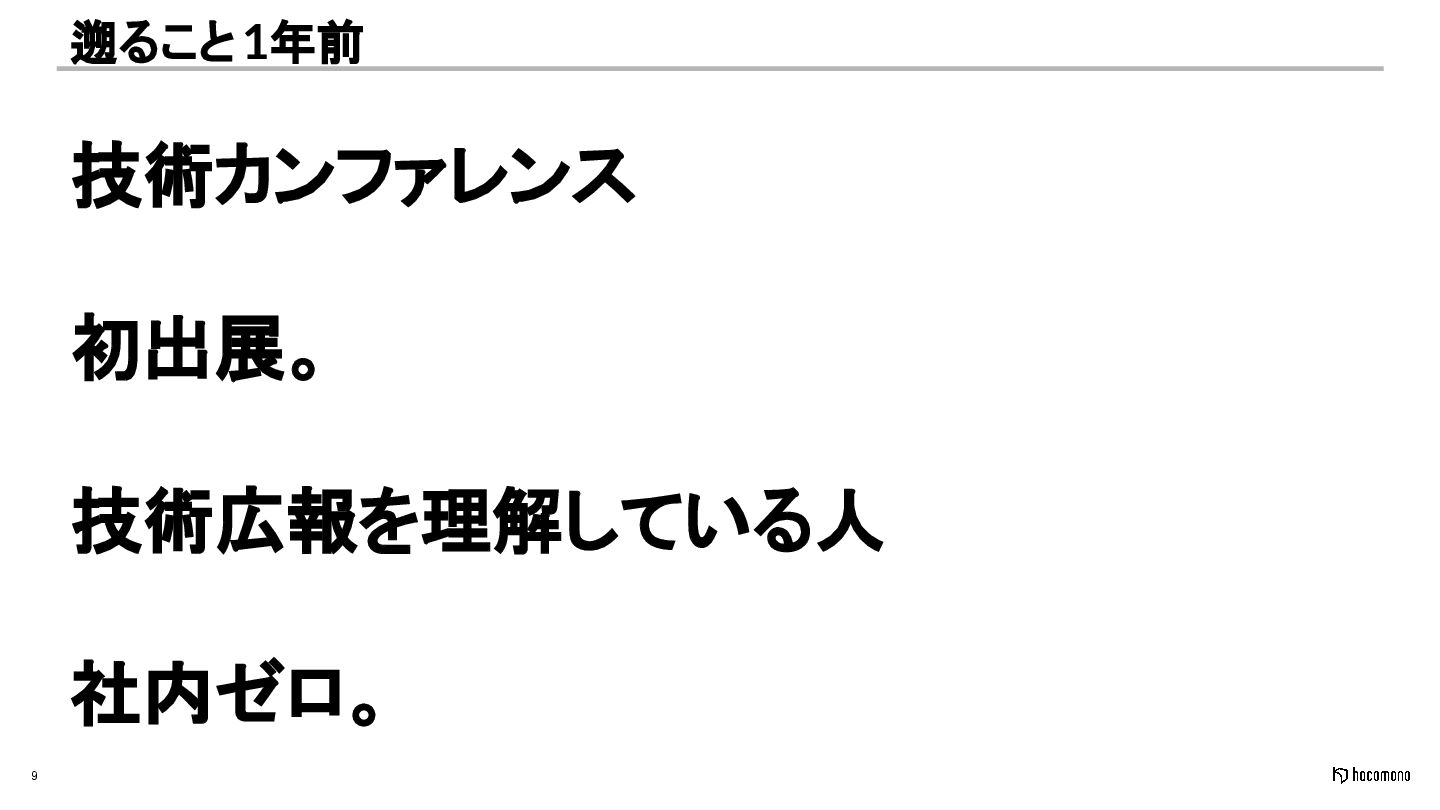 9 遡ること1年前 技術カンファレンス 初出展。 技術広報を理解している人 社内ゼロ。