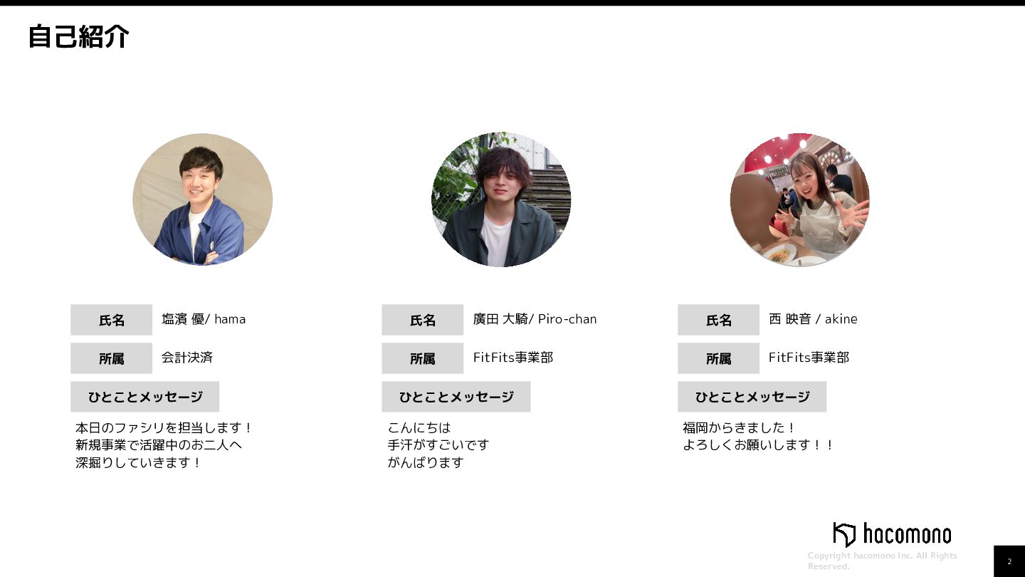 自己紹介 氏名 所属 ひとことメッセージ 塩濱 優/ hama 会計決済 本日のファシリを担当します! 新規事業で活躍中のお二人へ 深掘りしていきます! 氏名 所属 ひとことメッセージ 廣田 大騎/ Piro-chan FitFits事業部 こんにちは 手汗がすごいです がんばります 氏名 所属 ひとことメッセージ 西 映音 / akine FitFits事業部 福岡からきました! よろしくお願いします!!