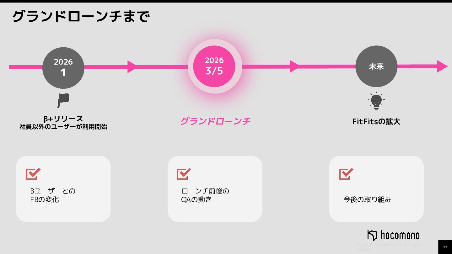 Bユーザーとの FBの変化 未来 ローンチ前後の QAの動き 今後の取り組み FitFitsの拡大 グランドローンチ 2026 1 2026 3/5