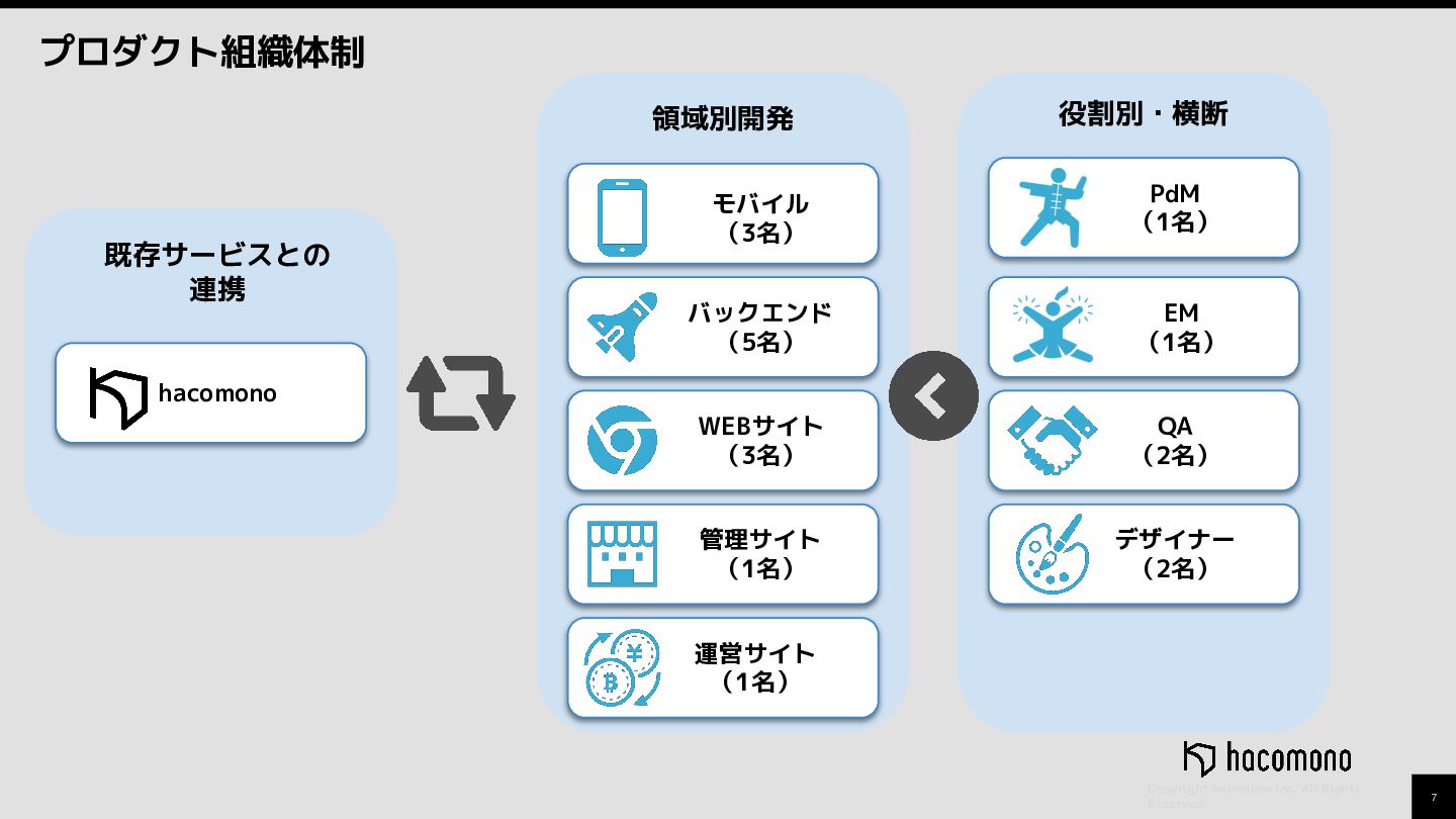 (1名) WEBサイト (3名) バックエンド (5名) モバイル (3名) PdM (1名) EM (1名) QA (2名) デザイナー (2名) 運営サイト (1名) 役割別・横断 既存サービスとの 連携 hacomono