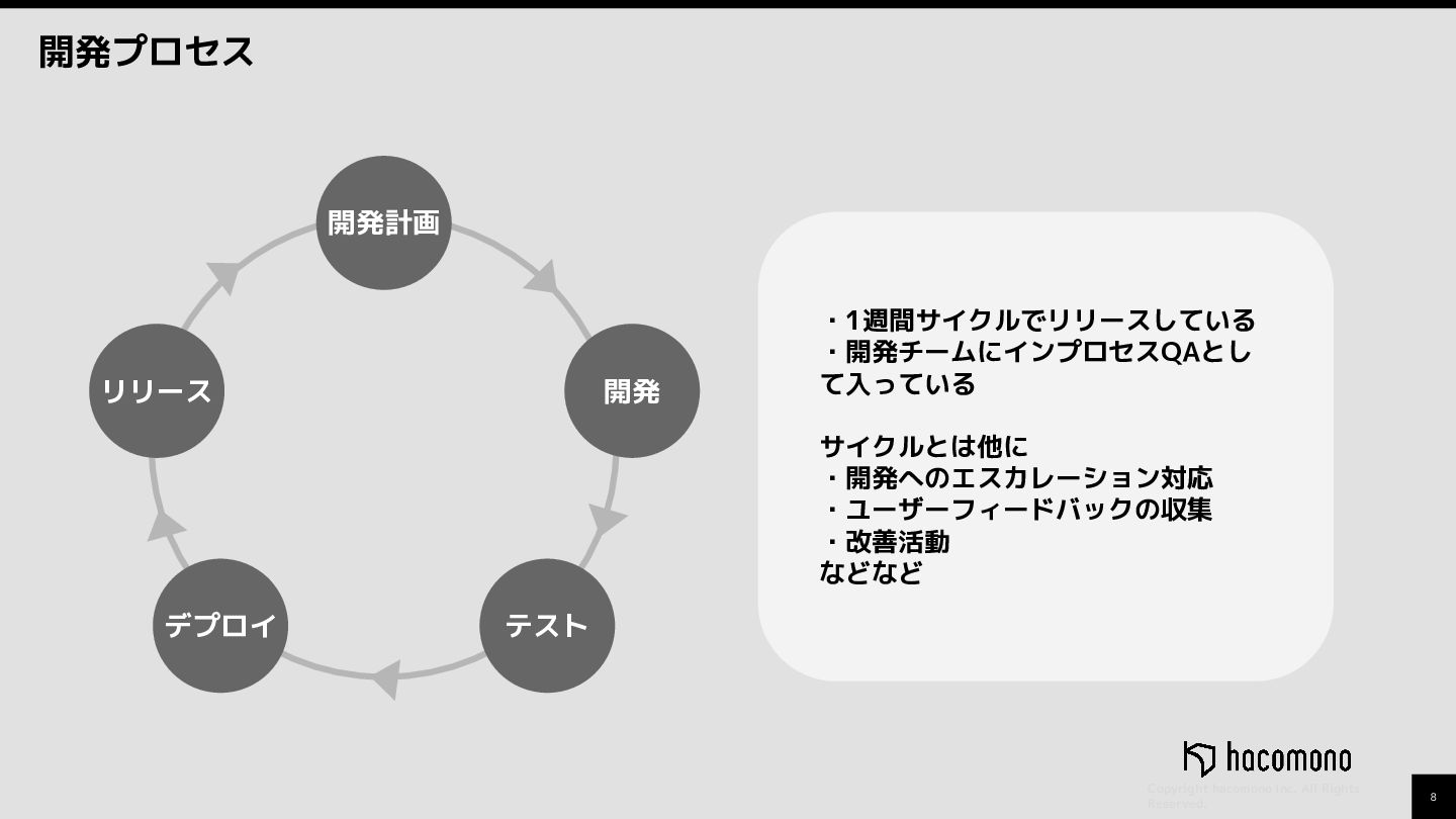 テスト デプロイ リリース ・1週間サイクルでリリースしている ・開発チームにインプロセスQAとし て入っている サイクルとは他に ・開発へのエスカレーション対応 ・ユーザーフィードバックの収集 ・改善活動 などなど