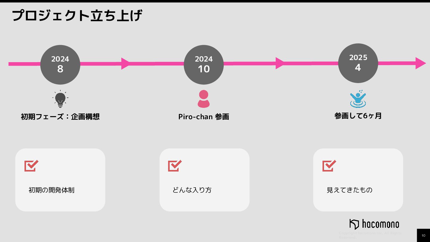 10 Copyright hacomono Inc. All Rights Reserved. プロジェクト立ち上げ 2024 8