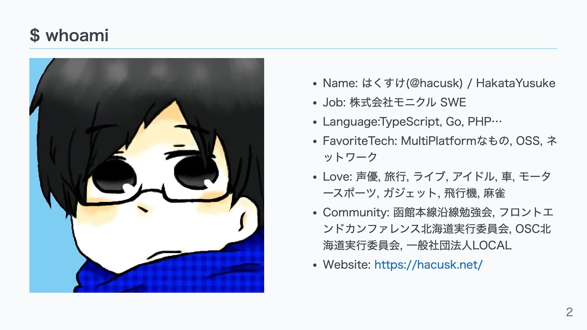 $ whoami Name: はくすけ(@hacusk) / HakataYusuke Job: 株式会社モニクル SWE Language:TypeScript,