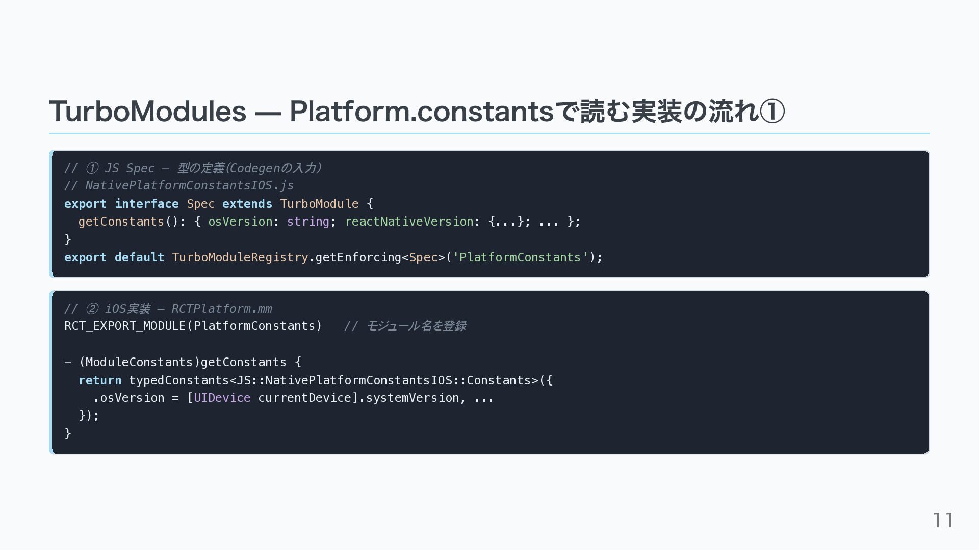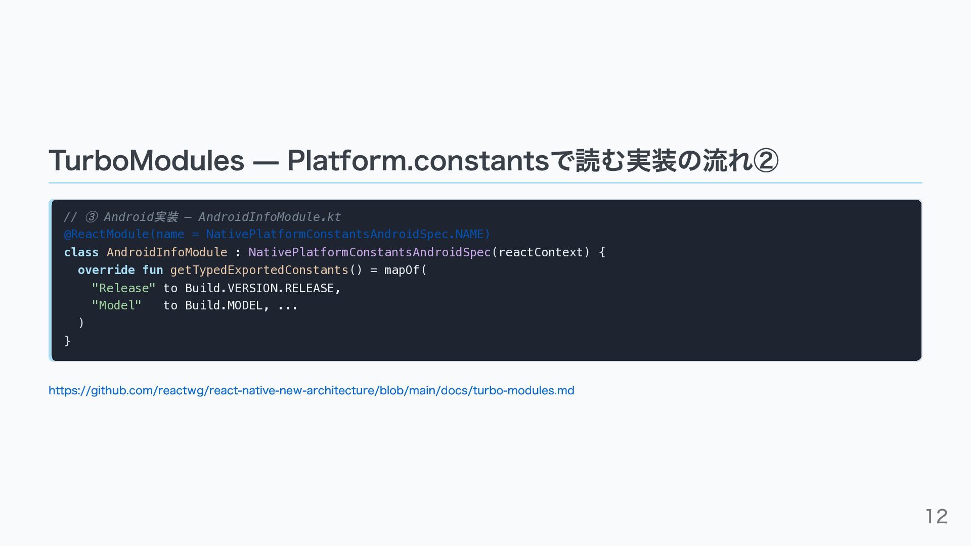 NativePlatformConstantsIOS.js export interface Spec extends TurboModule { getConstants(): { osVersion: string; reactNativeVersion: {...}; ... }; } export default TurboModuleRegistry.getEnforcing<Spec>('PlatformConstants'); // ② iOS実装 — RCTPlatform.mm RCT_EXPORT_MODULE(PlatformConstants) // モジュール名を登録 - (ModuleConstants)getConstants { return typedConstants<JS::NativePlatformConstantsIOS::Constants>({ .osVersion = [UIDevice currentDevice].systemVersion, ... }); } 11