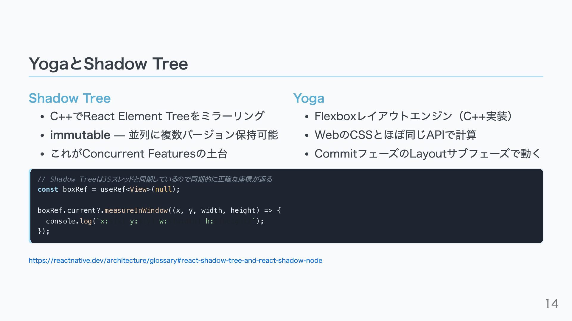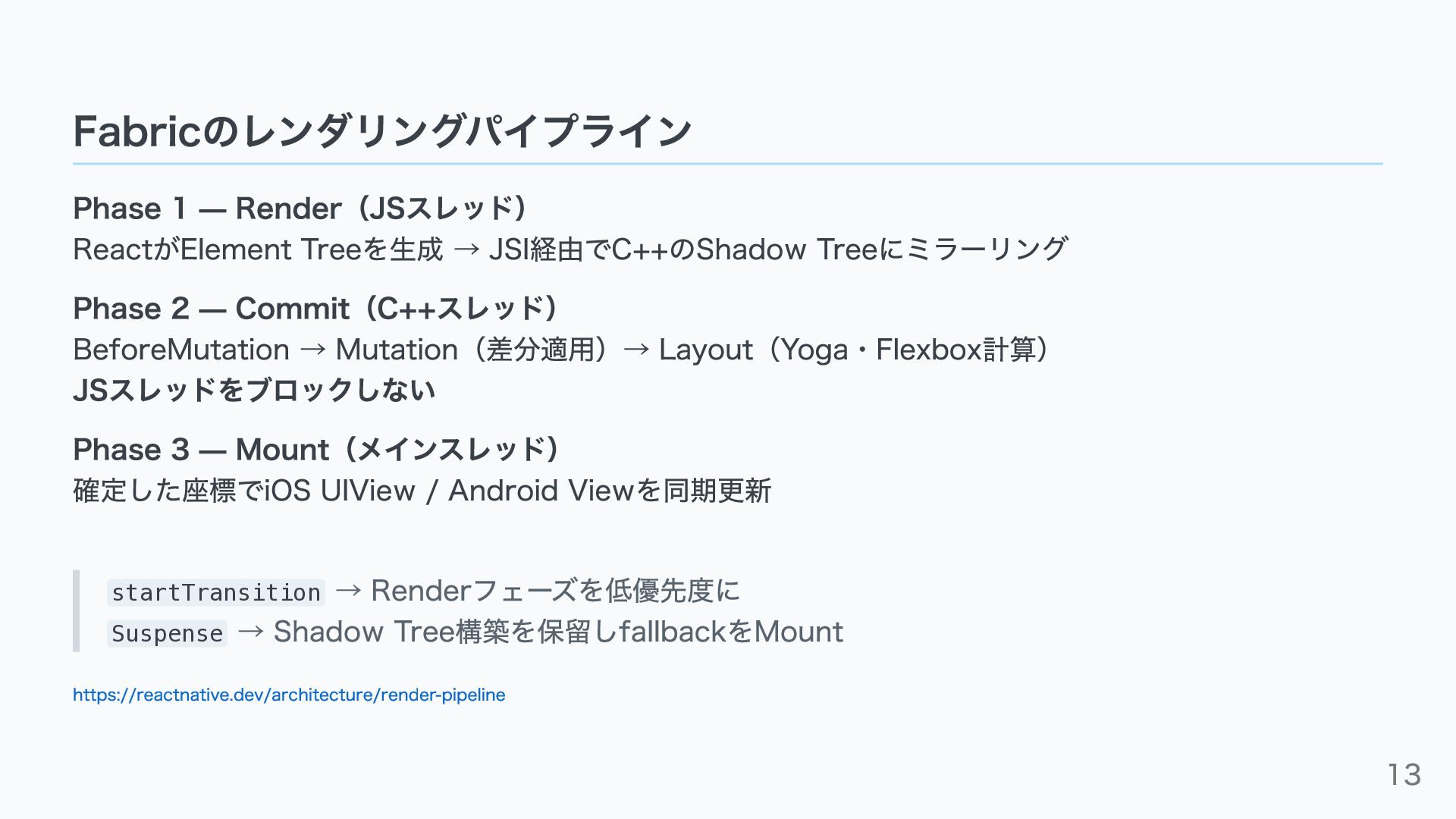 Phase 2 — Commit(C++スレッド) BeforeMutation → Mutation(差分適用)→ Layout(Yoga・Flexbox計算) JSスレッドをブロックしない Phase 3 — Mount(メインスレッド) 確定した座標でiOS UIView / Android Viewを同期更新 startTransition → Renderフェーズを低優先度に Suspense → Shadow Tree構築を保留しfallbackをMount https://reactnative.dev/architecture/render-pipeline 13