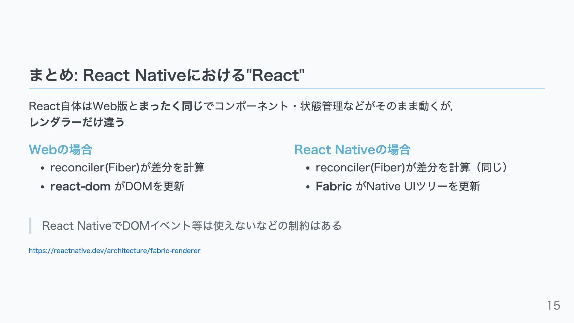 Nativeの場合 reconciler(Fiber)が差分を計算(同じ) Fabric がNative UIツリーを更新 React NativeでDOMイベント等は使えないなどの制約はある https://reactnative.dev/architecture/fabric-renderer 15