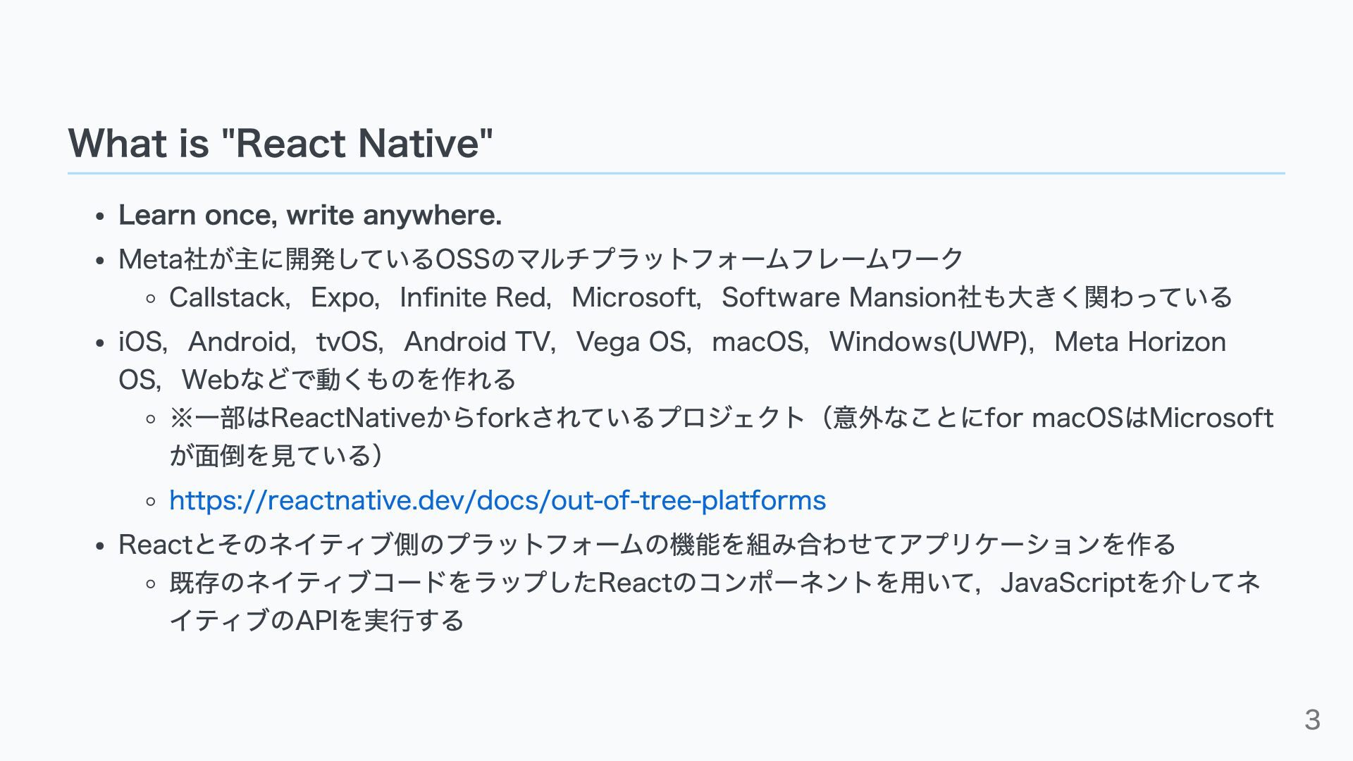 What is "React Native" Learn once, write anywhere. Meta社が主に開発しているOSSのマルチプラットフォームフレームワーク Callstack,Expo,Infinite