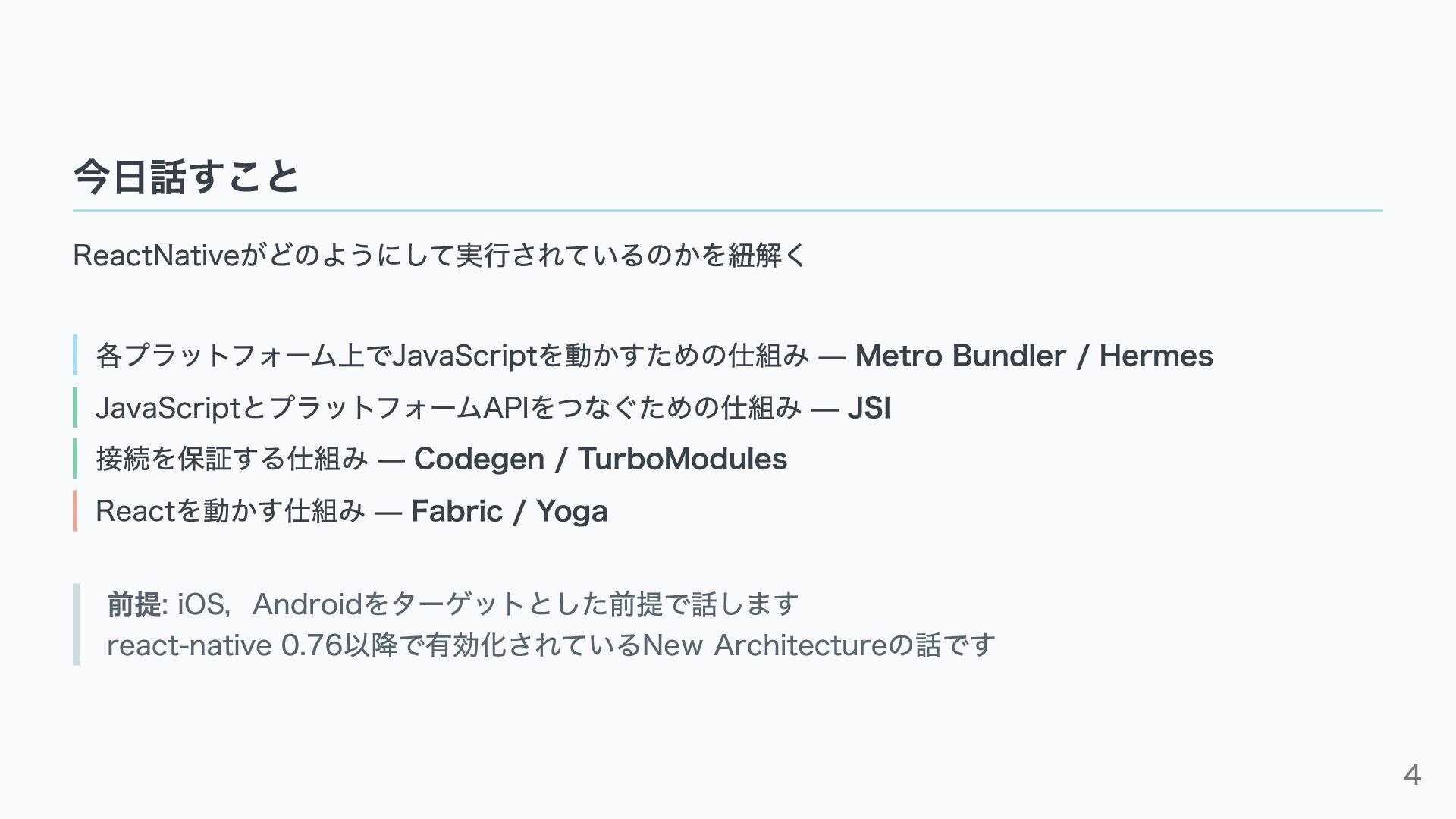 今日話すこと ReactNativeがどのようにして実行されているのかを紐解く 各プラットフォーム上でJavaScriptを動かすための仕組み — Metro Bundler / Hermes JavaScriptとプラットフォームAPIをつなぐための仕組み —