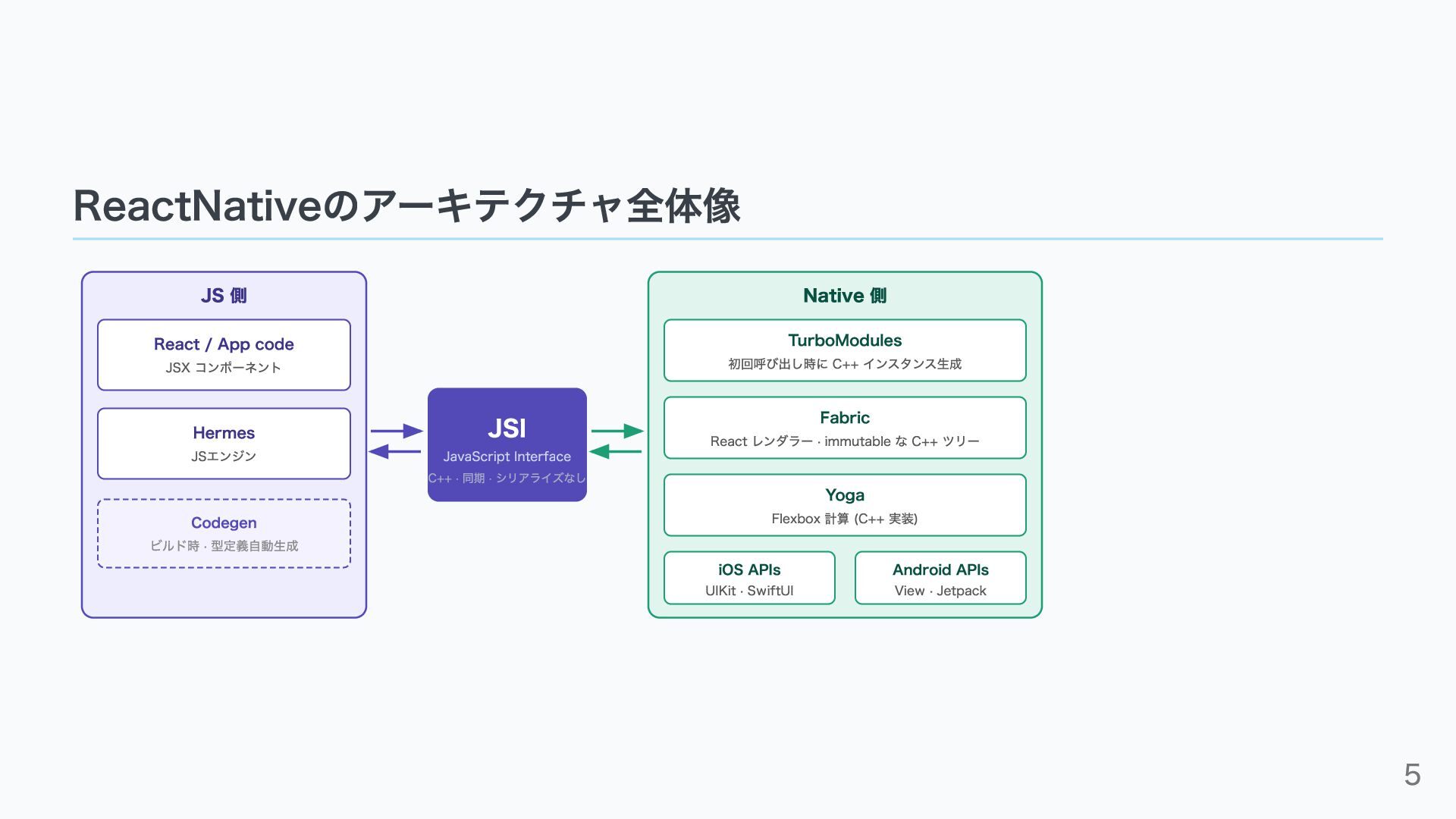 JSエンジン Codegen ビルド時 · 型定義⾃動⽣成 JSI JavaScript Interface C++ · 同期 · シリアライズなし Native 側 TurboModules 初回呼び出し時に C++ インスタンス⽣成 Fabric React レンダラー · immutable な C++ ツリー Yoga Flexbox 計算 (C++ 実装) iOS APIs UIKit · SwiftUI Android APIs View · Jetpack 5