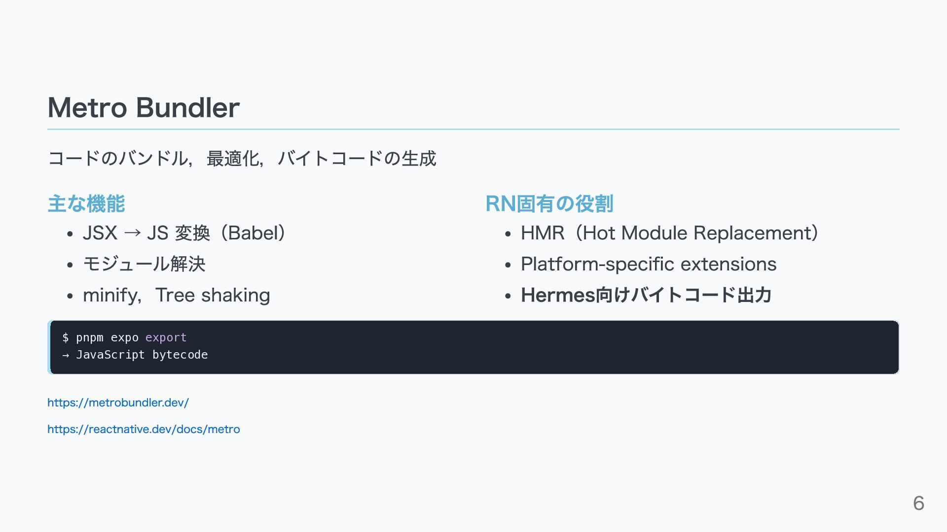 shaking RN固有の役割 HMR(Hot Module Replacement) Platform-specific extensions Hermes向けバイトコード出力 $ pnpm expo export → JavaScript bytecode https://metrobundler.dev/ https://reactnative.dev/docs/metro 6