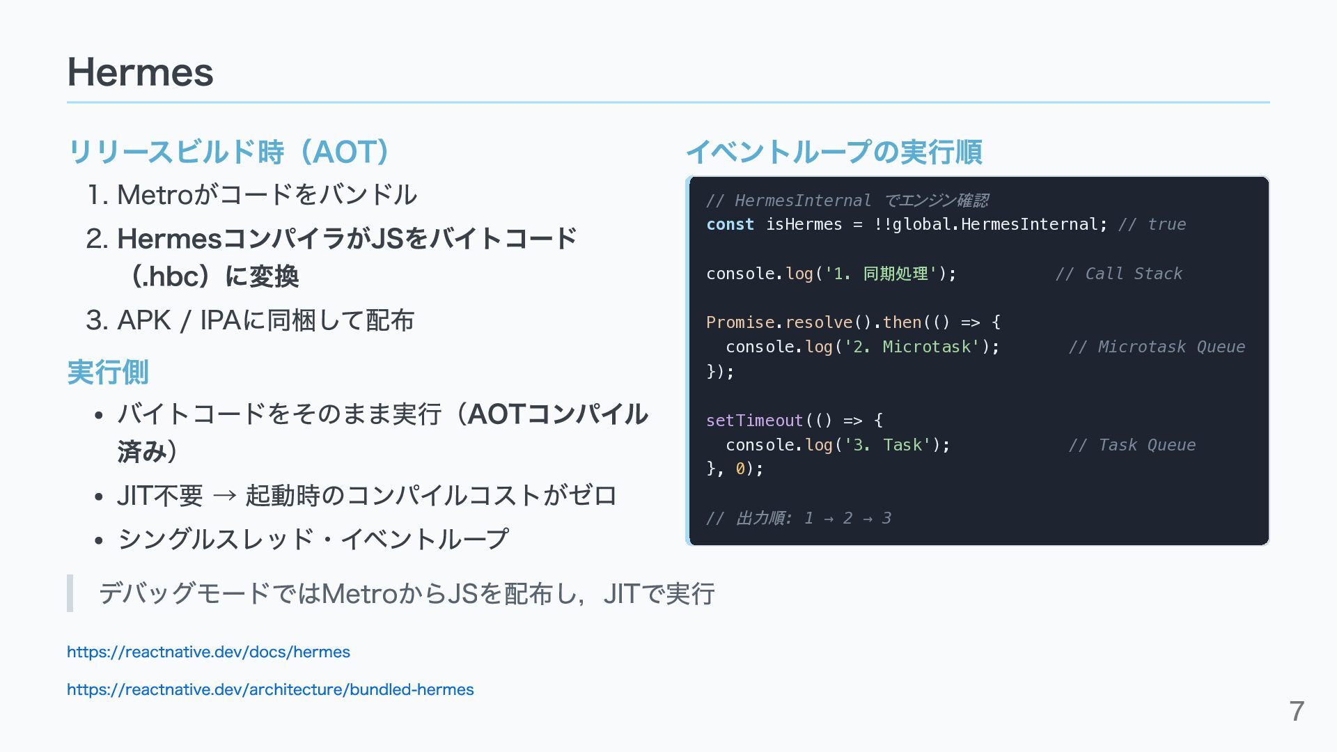 IPAに同梱して配布 実行側 バイトコードをそのまま実行(AOTコンパイル 済み) JIT不要 → 起動時のコンパイルコストがゼロ シングルスレッド・イベントループ イベントループの実行順 // HermesInternal でエンジン確認 const isHermes = !!global.HermesInternal; // true console.log('1. 同期処理'); // Call Stack Promise.resolve().then(() => { console.log('2. Microtask'); // Microtask Queue }); setTimeout(() => { console.log('3. Task'); // Task Queue }, 0); // 出力順: 1 → 2 → 3 デバッグモードではMetroからJSを配布し,JITで実行 https://reactnative.dev/docs/hermes https://reactnative.dev/architecture/bundled-hermes 7