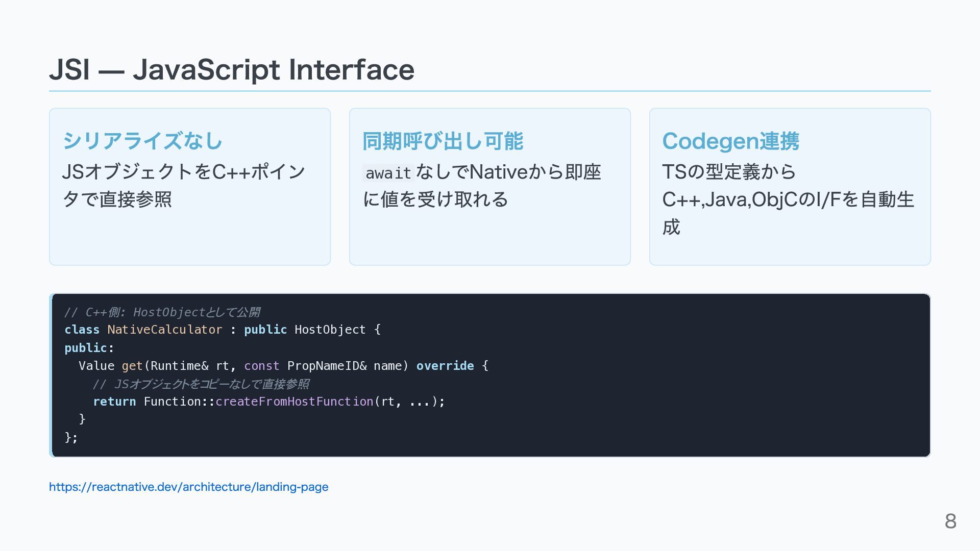 JSI — JavaScript Interface シリアライズなし JSオブジェクトをC++ポイン タで直接参照 同期呼び出し可能 await なしでNativeから即座