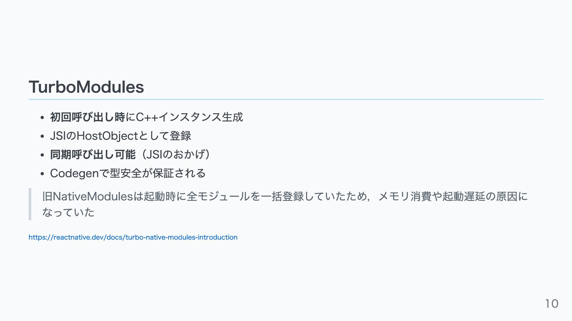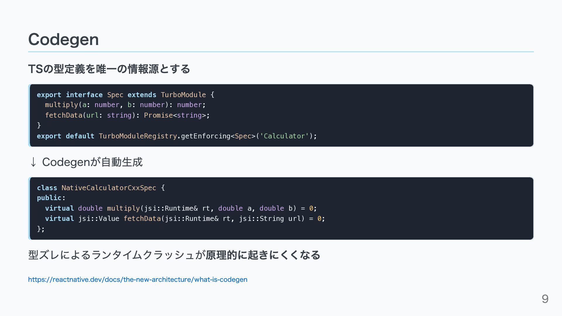 b: number): number; fetchData(url: string): Promise<string>; } export default TurboModuleRegistry.getEnforcing<Spec>('Calculator'); ↓ Codegenが自動生成 class NativeCalculatorCxxSpec { public: virtual double multiply(jsi::Runtime& rt, double a, double b) = 0; virtual jsi::Value fetchData(jsi::Runtime& rt, jsi::String url) = 0; }; 型ズレによるランタイムクラッシュが原理的に起きにくくなる https://reactnative.dev/docs/the-new-architecture/what-is-codegen 9