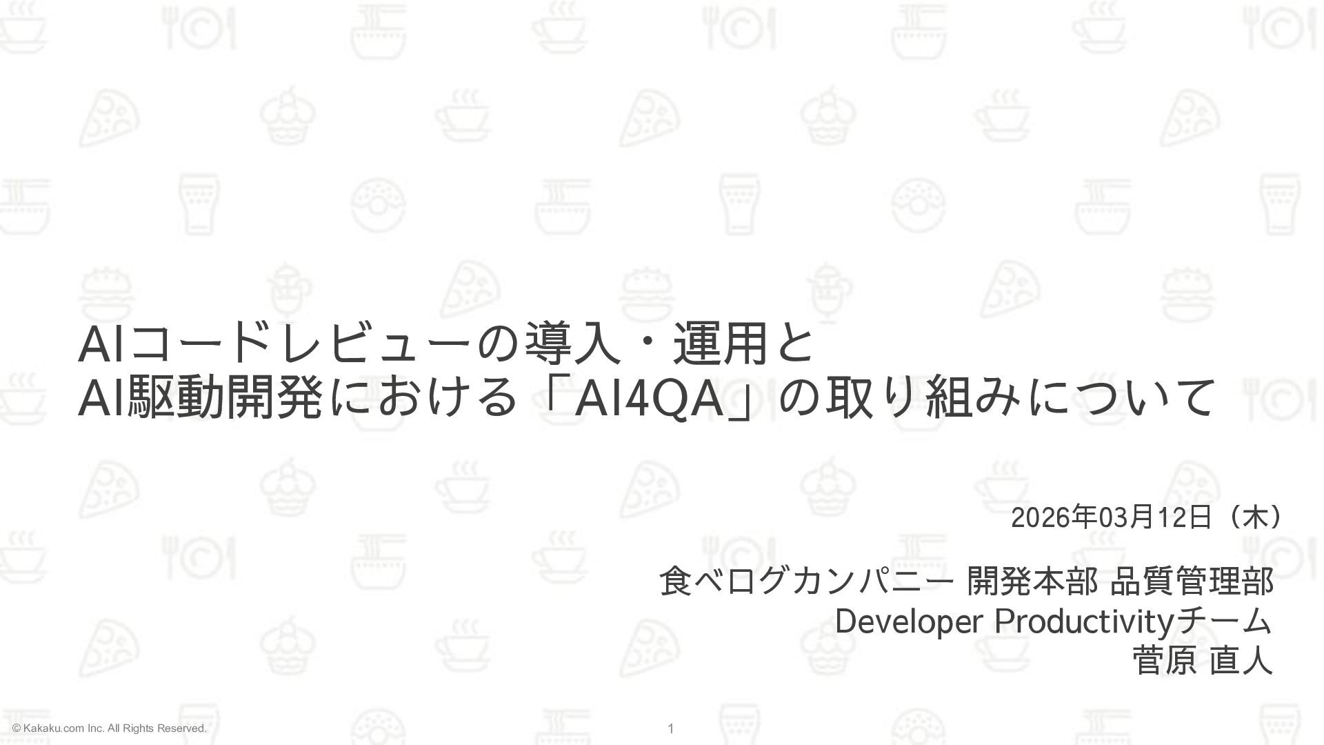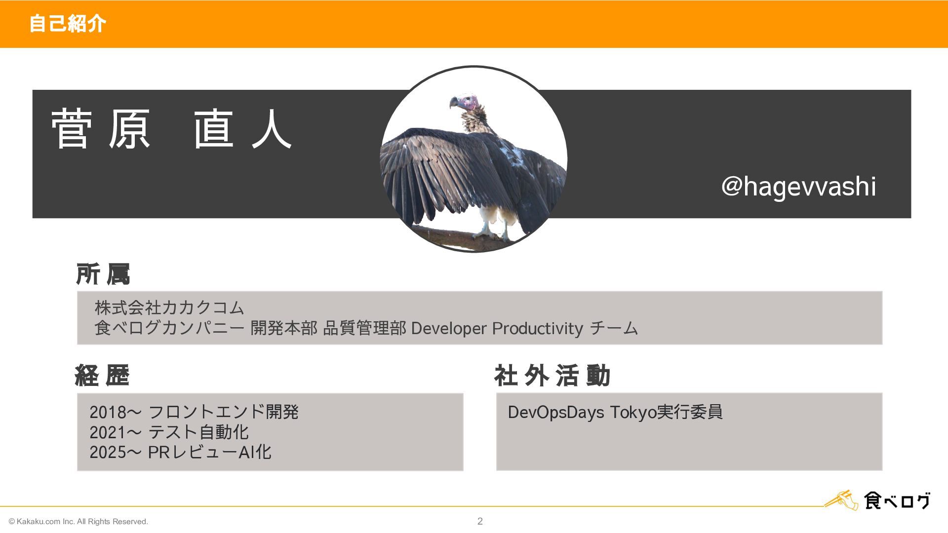 社 外 活 動 所 属 @hagevvashi 株式会社カカクコム 食べログカンパニー 開発本部 品質管理部 Developer Productivity チーム 菅 原 直 人 DevOpsDays Tokyo実行委員 2018〜 フロントエンド開発 2021〜 テスト自動化 2025〜 PRレビューAI化