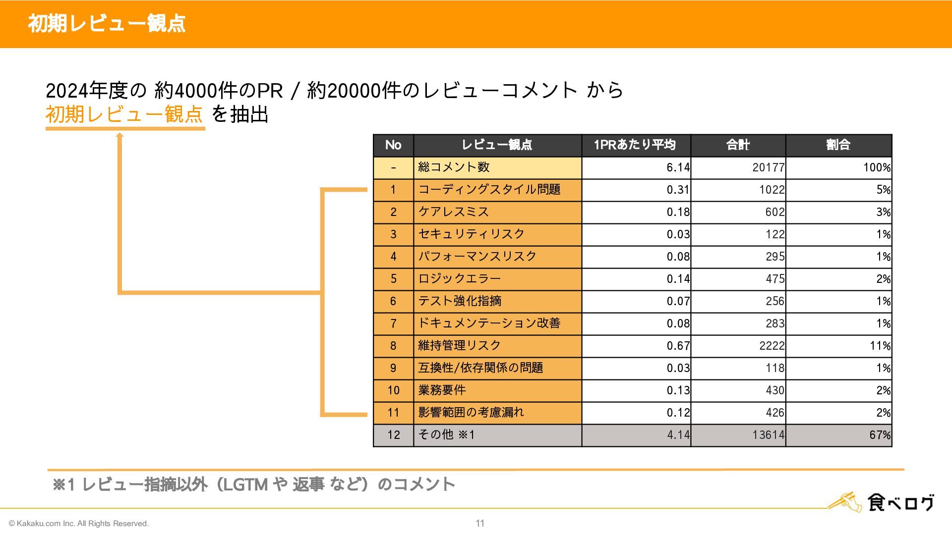 1PRあたり平均 合計 割合 - 総コメント数 6.14   20177   100%   1 コーディングスタイル問題 0.31   1022   5%   2 ケアレスミス 0.18   602   3%   3 セキュリティリスク 0.03   122   1%   4 パフォーマンスリスク 0.08   295   1%   5 ロジックエラー 0.14   475   2%   6 テスト強化指摘 0.07   256   1%   7 ドキュメンテーション改善 0.08   283   1%   8 維持管理リスク 0.67   2222   11%   9 互換性/依存関係の問題 0.03   118   1%   10 業務要件 0.13   430   2%   11 影響範囲の考慮漏れ 0.12   426   2%   12 その他 ※1 4.14   13614   67%  2024年度の 約4000件のPR / 約20000件のレビューコメント から 初期レビュー観点 を抽出 ※1 レビュー指摘以外(LGTM や 返事 など)のコメント