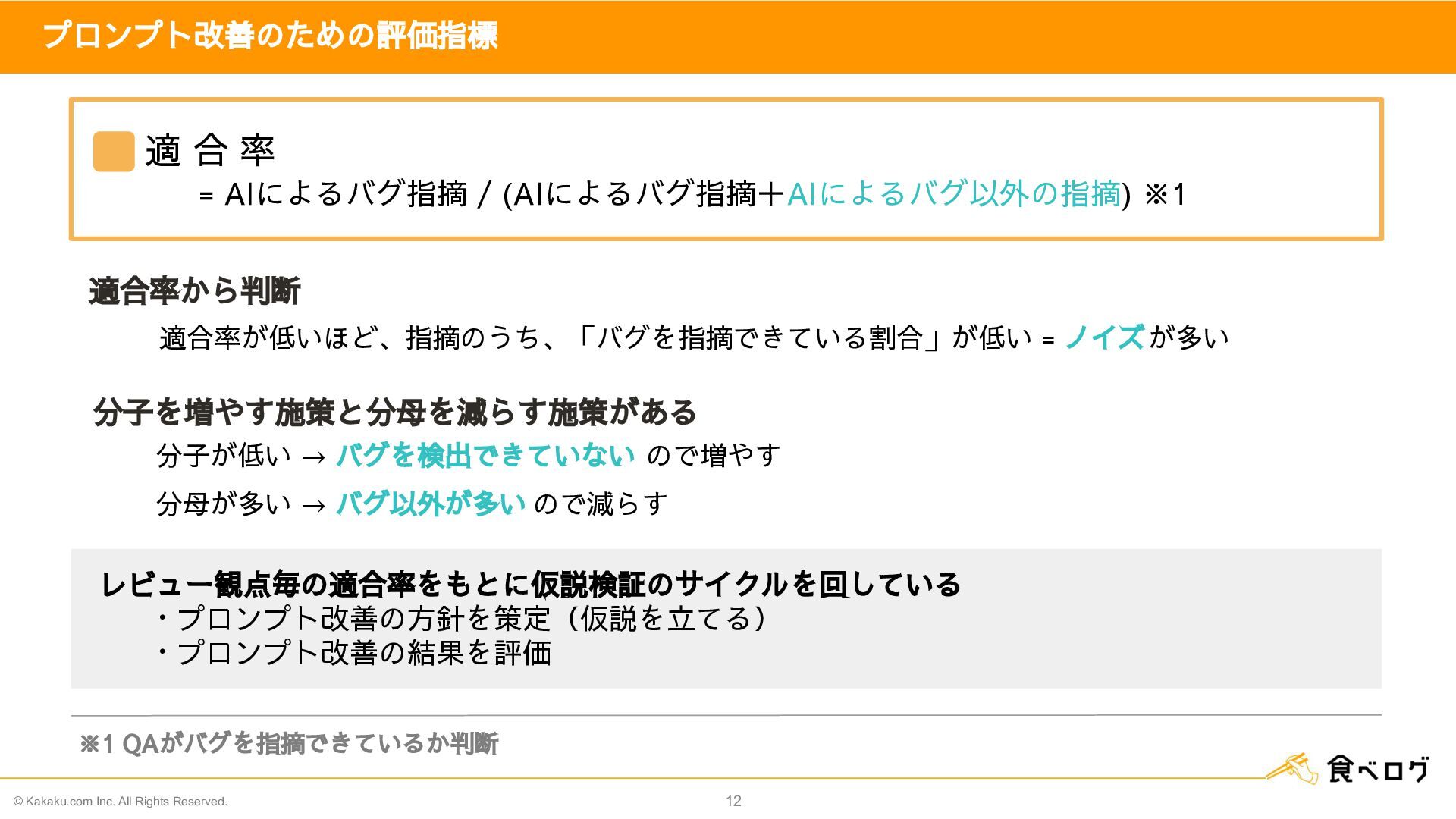 8. © Kakaku.com Inc. All Rights Reserved. 12 プロンプト改善のための評価指標 ※1 QAがバグを指摘できているか判断