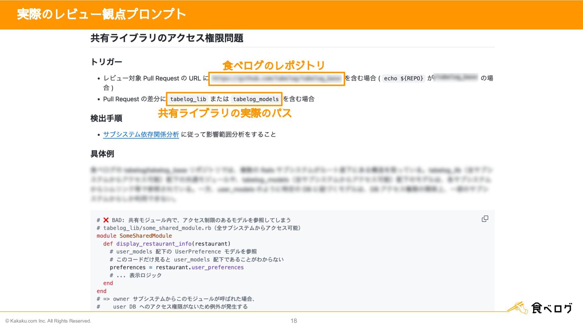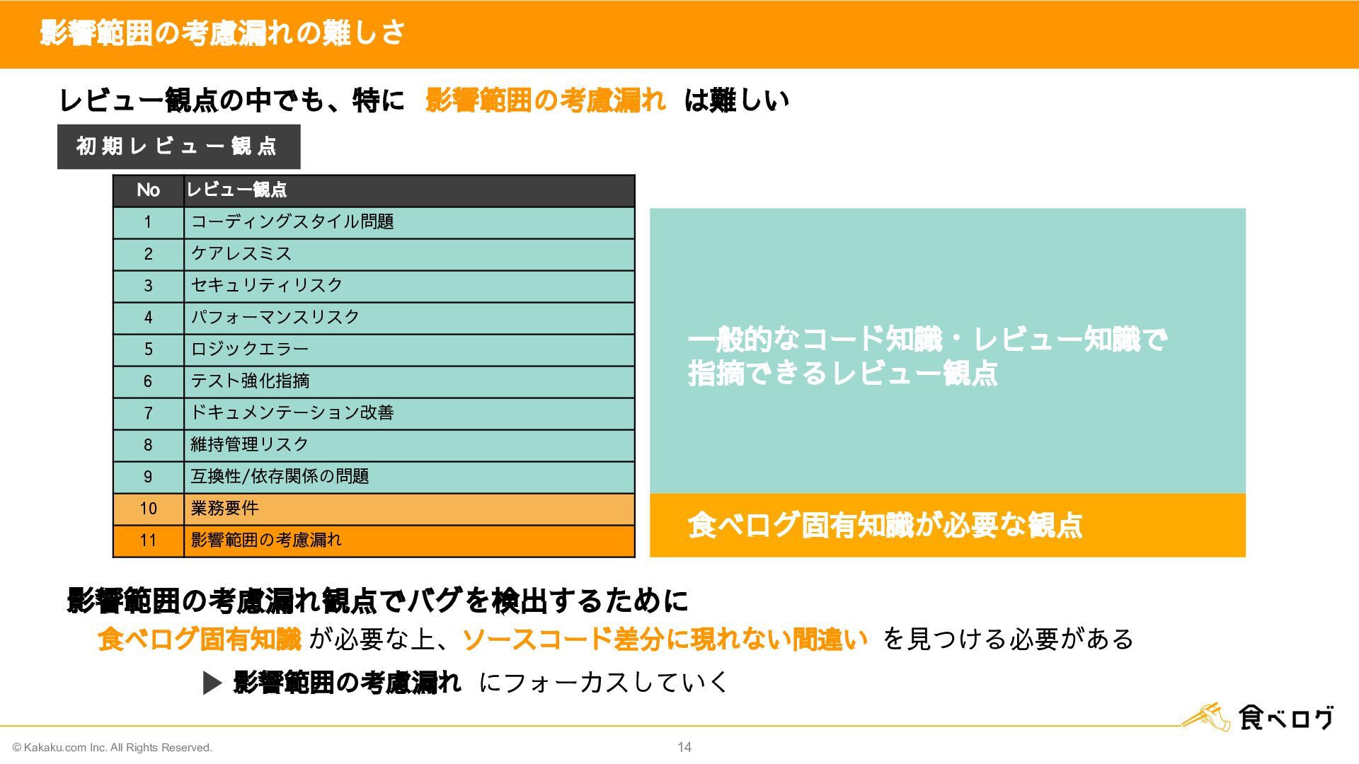 レ ビ ュ ー 観 点 レビュー観点の中でも、特に 影響範囲の考慮漏れ は難しい 影響範囲の考慮漏れ にフォーカスしていく    一般的なコード知識・レビュー知識で  指摘できるレビュー観点 No レビュー観点 1 コーディングスタイル問題 2 ケアレスミス 3 セキュリティリスク 4 パフォーマンスリスク 5 ロジックエラー 6 テスト強化指摘 7 ドキュメンテーション改善 8 維持管理リスク 9 互換性/依存関係の問題 10 業務要件 11 影響範囲の考慮漏れ  食べログ固有知識が必要な観点 食べログ固有知識 が必要な上、ソースコード差分に現れない間違い を見つける必要がある 影響範囲の考慮漏れ観点でバグを検出するために