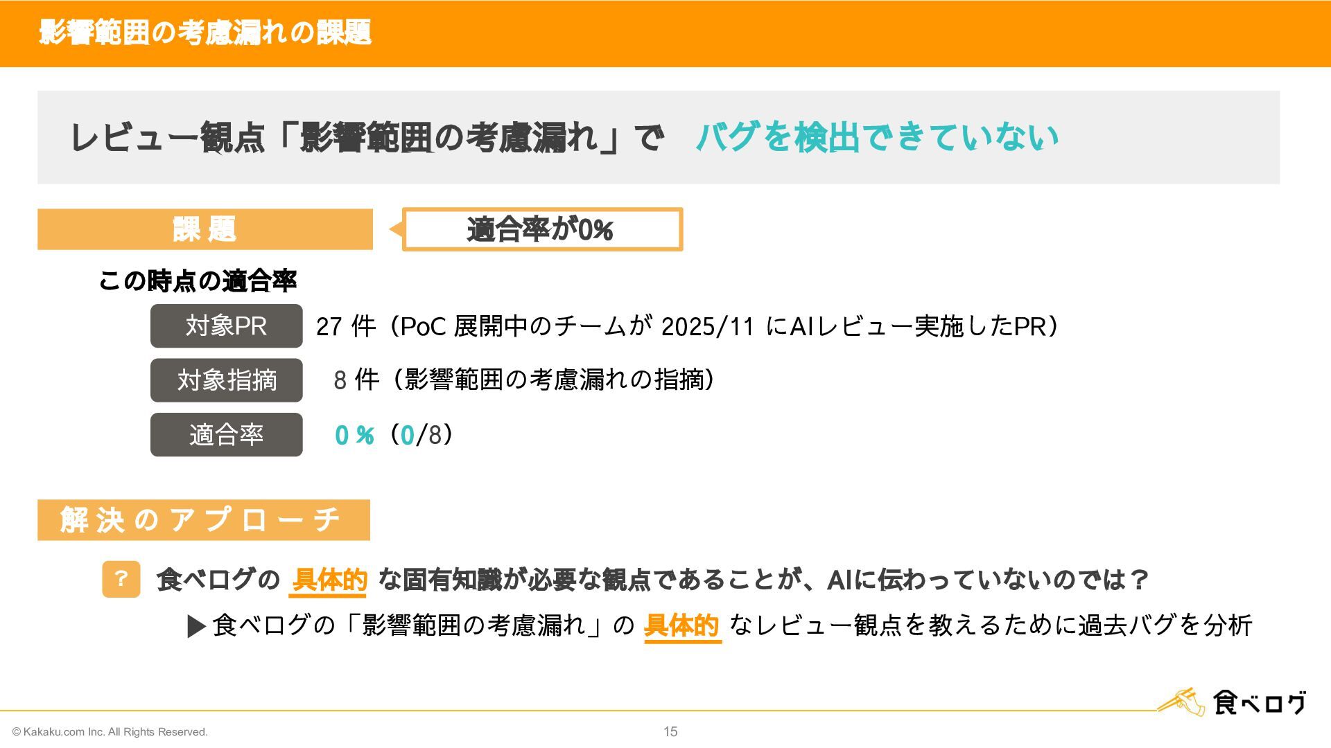 食べログの「影響範囲の考慮漏れ」の 具体的 なレビュー観点を教えるために過去バグを分析 解 決 の ア プ ロ ー チ この時点の適合率 27 件(PoC 展開中のチームが 2025/11 にAIレビュー実施したPR) 0 %(0/8) 8 件(影響範囲の考慮漏れの指摘) 課 題 適合率が0% ? 対象PR 対象指摘 適合率 食べログの 具体的 な固有知識が必要な観点であることが、AIに伝わっていないのでは?