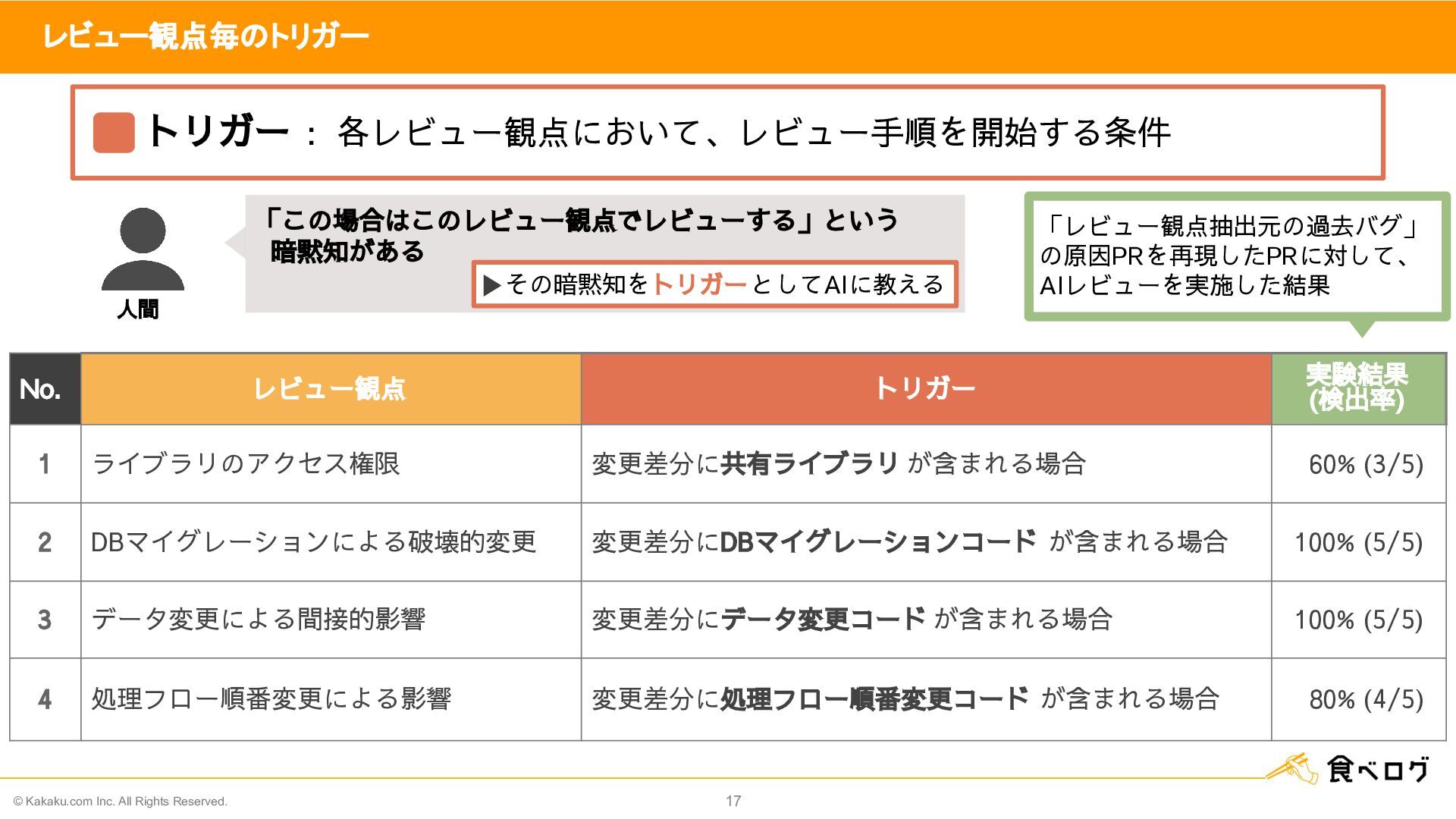 トリガー 実験結果 (検出率) 1 ライブラリのアクセス権限 変更差分に共有ライブラリ が含まれる場合 60% (3/5) 2 DBマイグレーションによる破壊的変更 変更差分にDBマイグレーションコード が含まれる場合 100% (5/5) 3 データ変更による間接的影響 変更差分にデータ変更コード が含まれる場合 100% (5/5) 4 処理フロー順番変更による影響 変更差分に処理フロー順番変更コード が含まれる場合 80% (4/5) 「この場合はこのレビュー観点でレビューする」という 暗黙知がある 「レビュー観点抽出元の過去バグ」 の原因PRを再現したPRに対して、 AIレビューを実施した結果 人間 トリガー : 各レビュー観点において、レビュー手順を開始する条件 その暗黙知をトリガーとしてAIに教える
