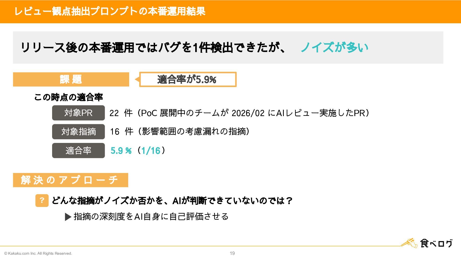13. © Kakaku.com Inc. All Rights Reserved. リリース後の本番運用ではバグを1件検出できたが、 ノイズが多い 19 レビュー観点抽出プロンプトの本番運用結果