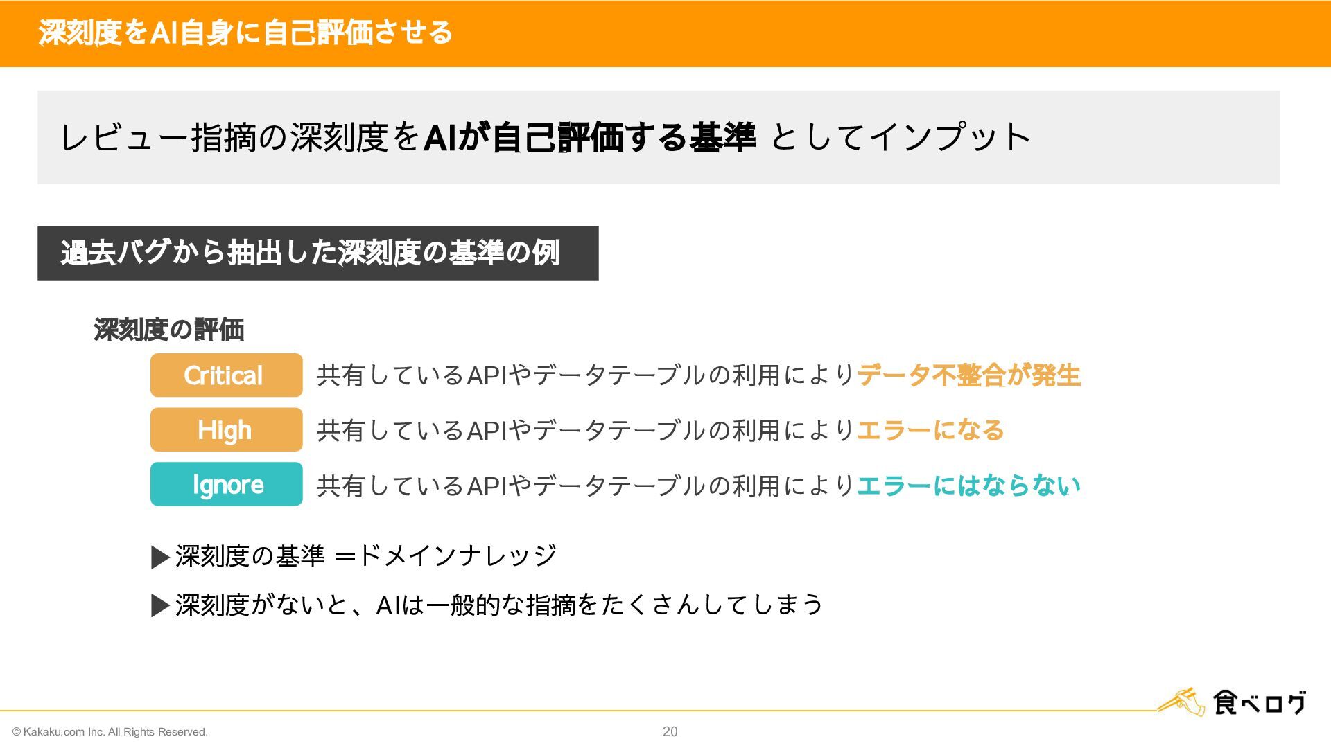 14. © Kakaku.com Inc. All Rights Reserved. 20 深刻度をAI自身に自己評価させる 深刻度の基準 =ドメインナレッジ