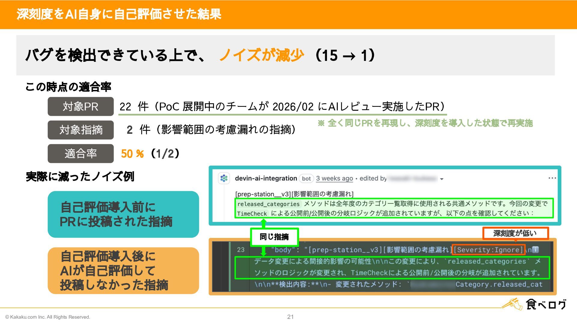 15. © Kakaku.com Inc. All Rights Reserved. 21 深刻度をAI自身に自己評価させた結果 ※ 全く同じPRを再現し、深刻度を導入した状態で再実施