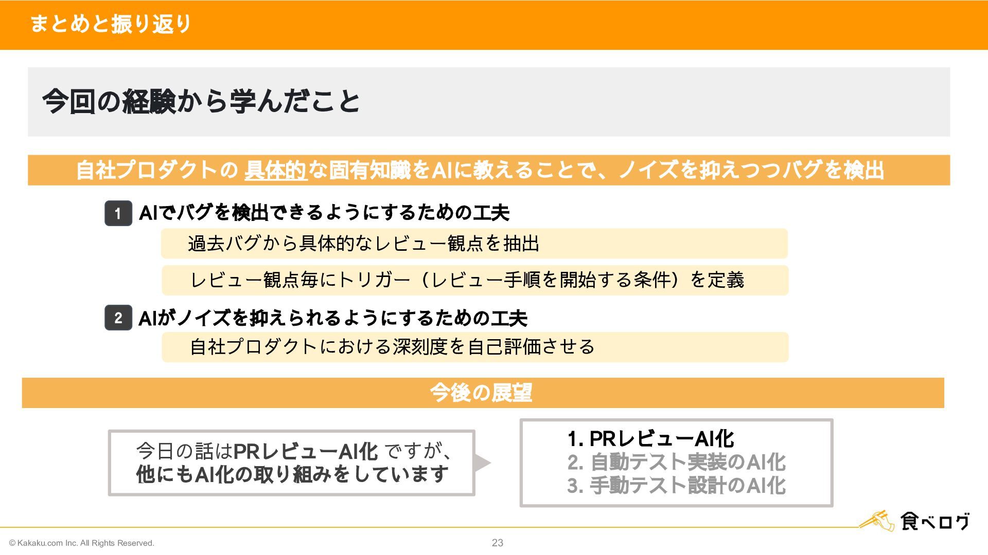16. © Kakaku.com Inc. All Rights Reserved. 23 まとめと振り返り 今回の経験から学んだこと AIでバグを検出できるようにするための工夫