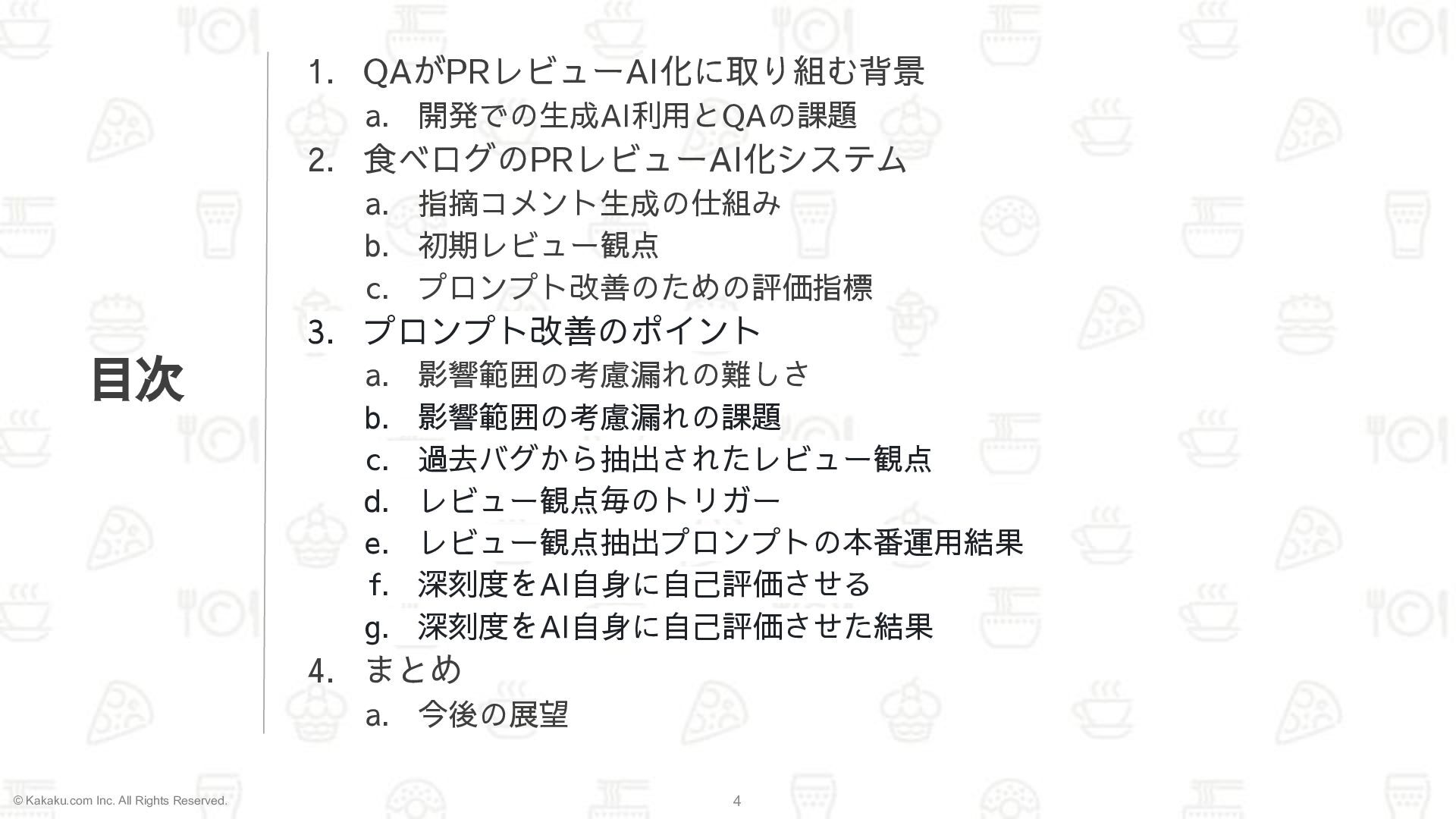 2. © Kakaku.com Inc. All Rights Reserved. 4 目次 1. QAがPRレビューAI化に取り組む背景