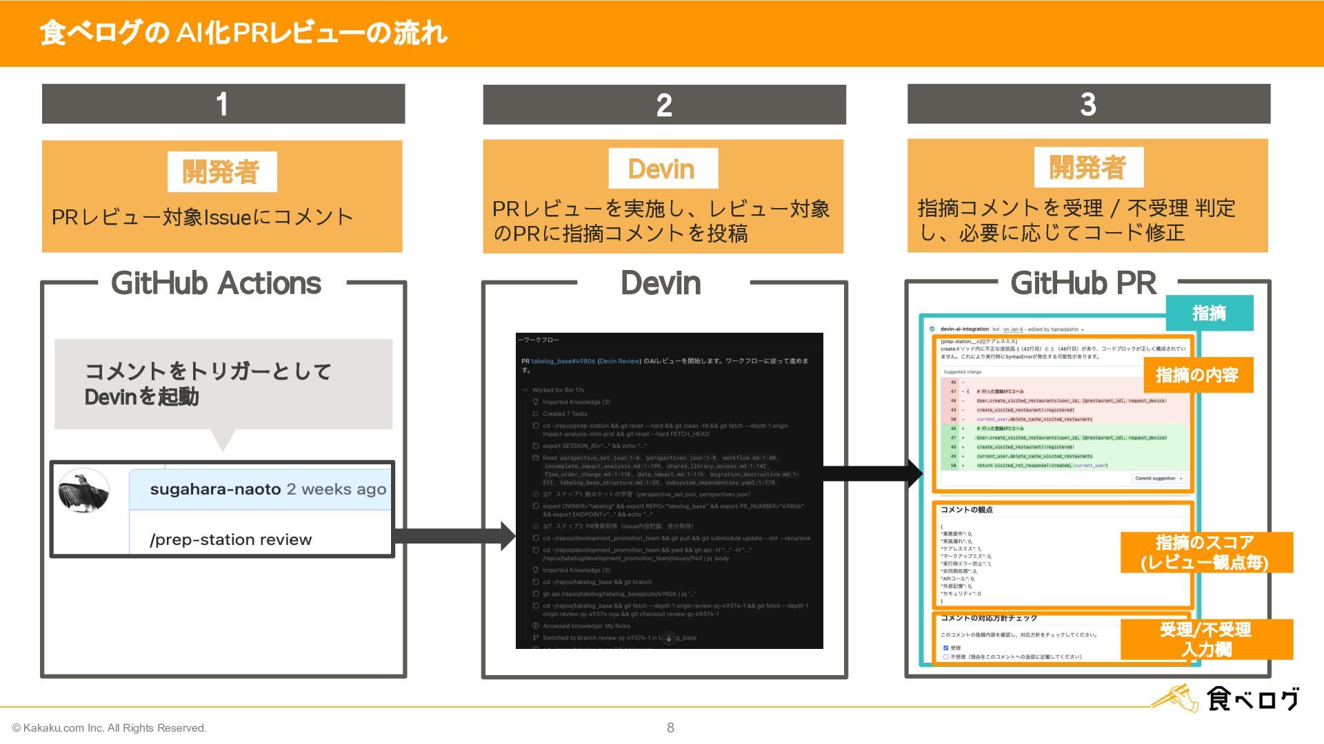 2 3 PRレビューを実施し、レビュー対象 のPRに指摘コメントを投稿 PRレビュー対象Issueにコメント 指摘コメントを受理 / 不受理 判定 し、必要に応じてコード修正 GitHub Actions Devin GitHub PR  コメントをトリガーとして  Devinを起動 開発者 Devin 開発者 指摘の内容 指摘のスコア (レビュー観点毎) 受理/不受理 入力欄 指摘