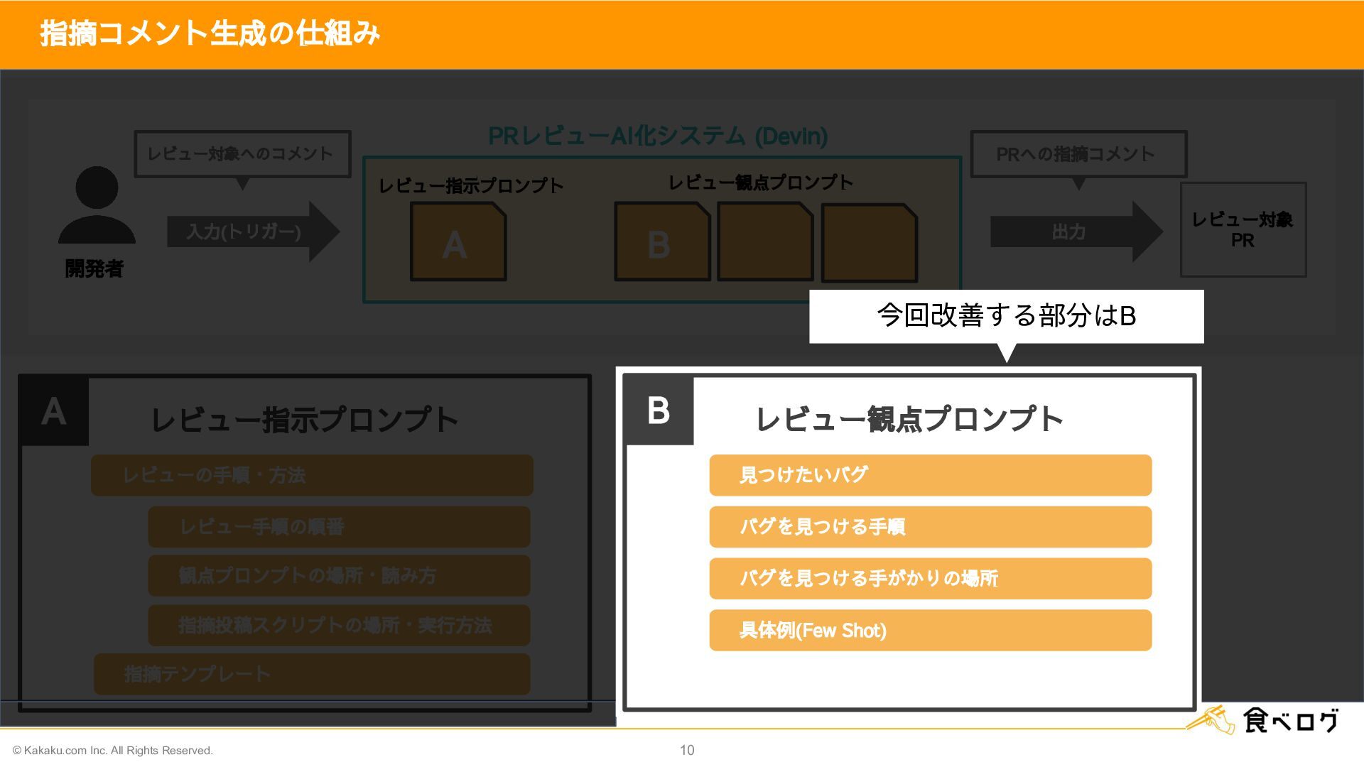 レビュー対象 PR A レビュー指示プロンプト レビュー観点プロンプト B 開発者 入力(トリガー) 出力 レビュー対象へのコメント PRへの指摘コメント  レビューの手順・方法  レビュー手順の順番  観点プロンプトの場所・読み方  指摘投稿スクリプトの場所・実行方法  指摘テンプレート A レビュー指示プロンプト B レビュー観点プロンプト  見つけたいバグ  バグを見つける手順  バグを見つける手がかりの場所  具体例(Few Shot) 今回改善する部分はB