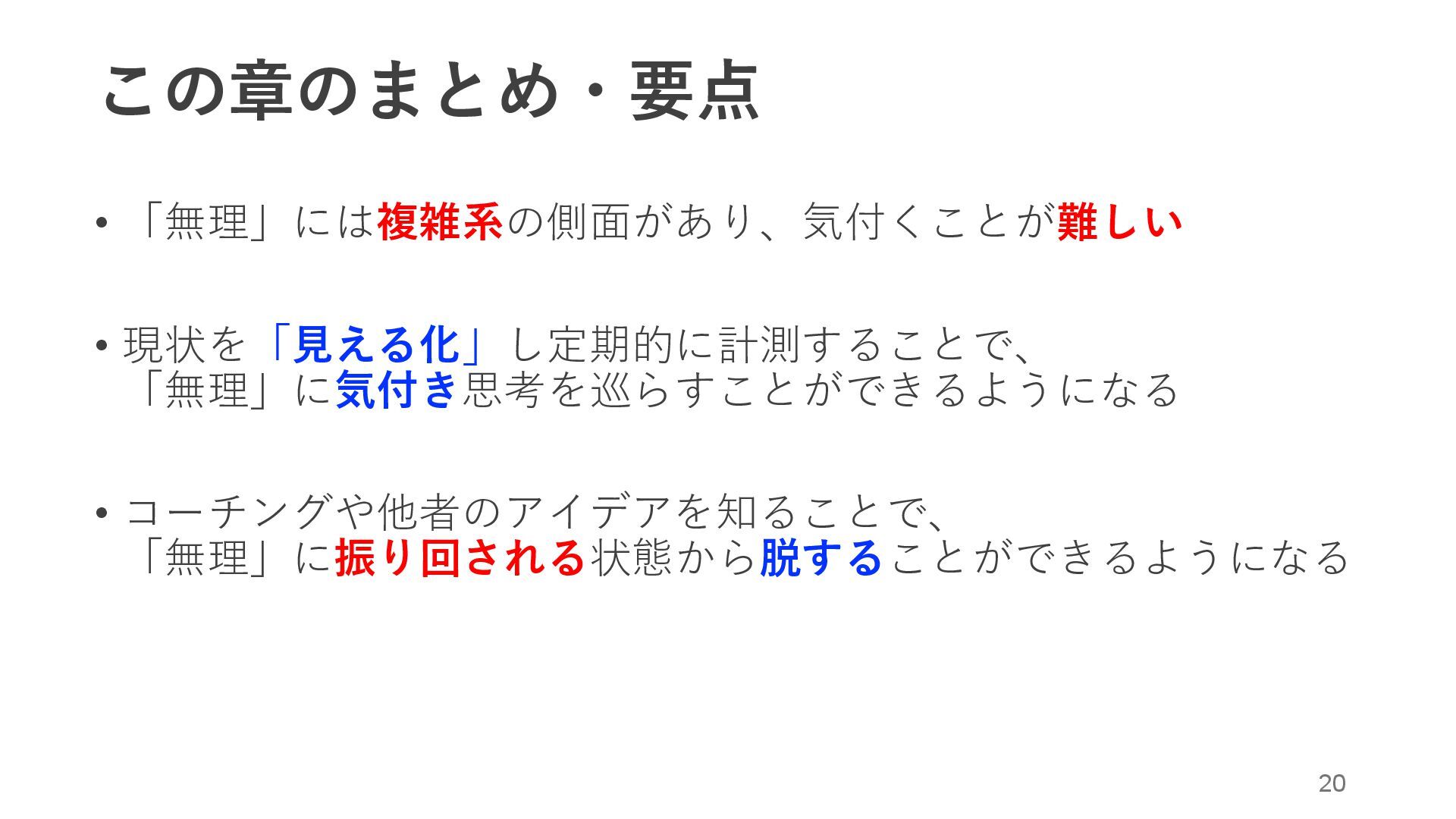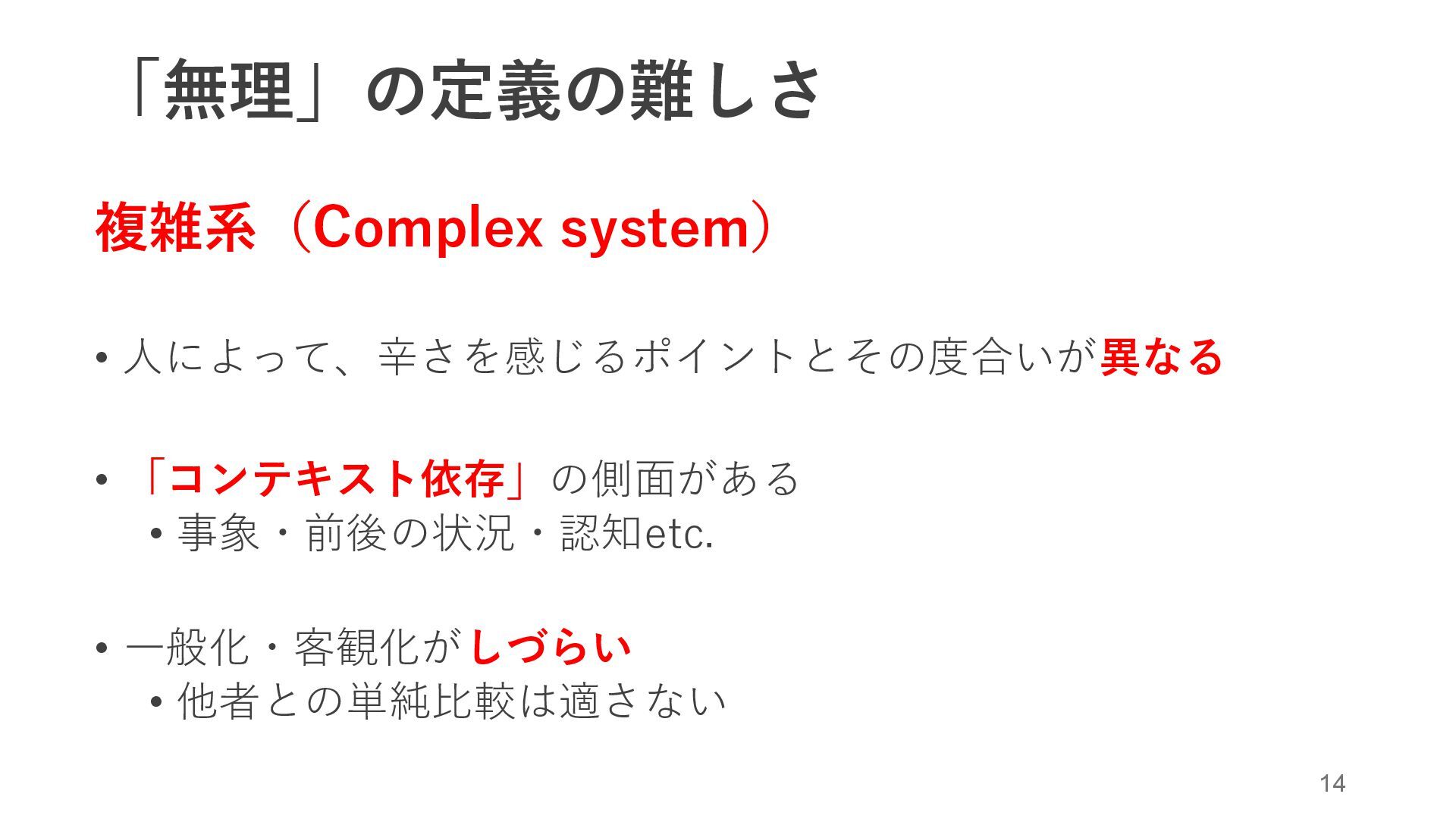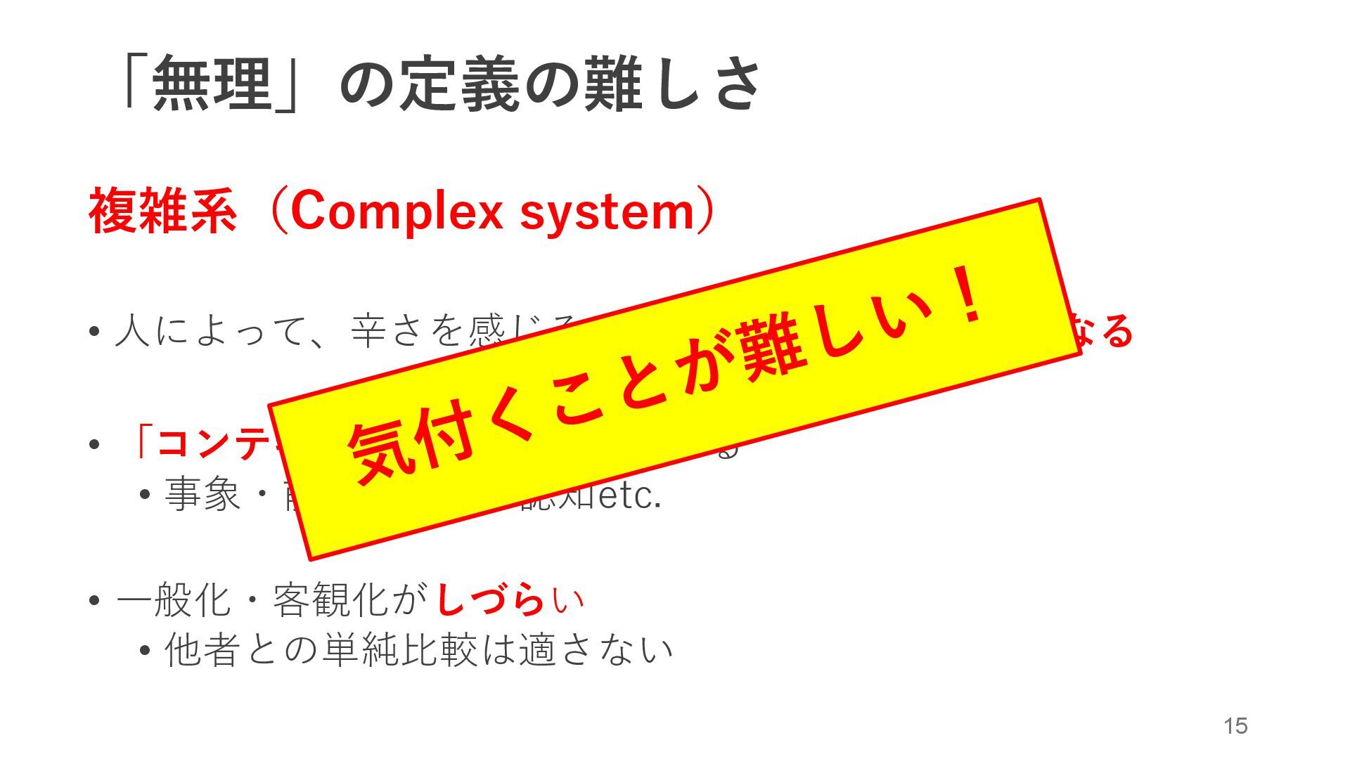 当資料では、自発的に「無理」に気付き減らすことの難しさを、「複雑系」であることに由来すると捉えています。