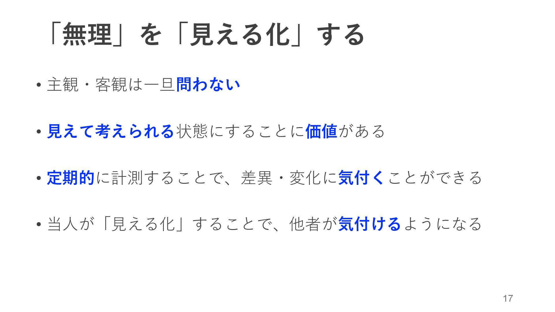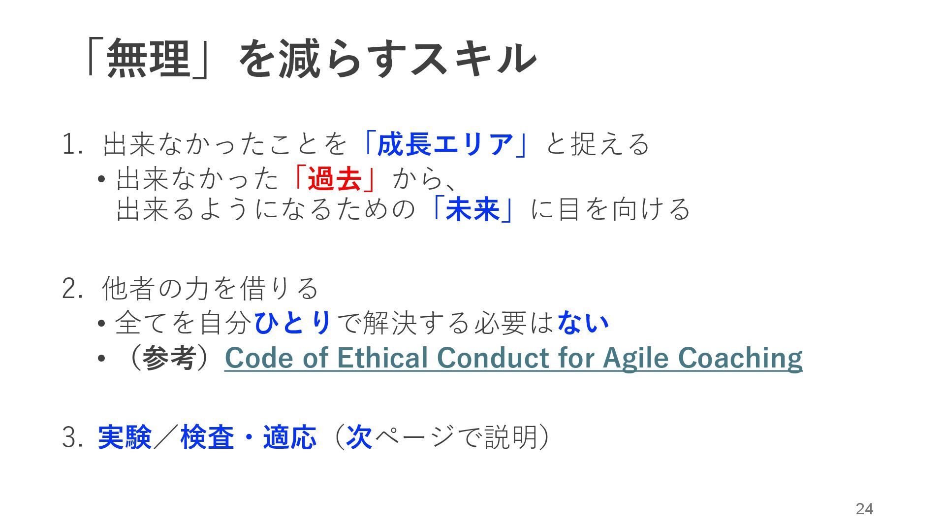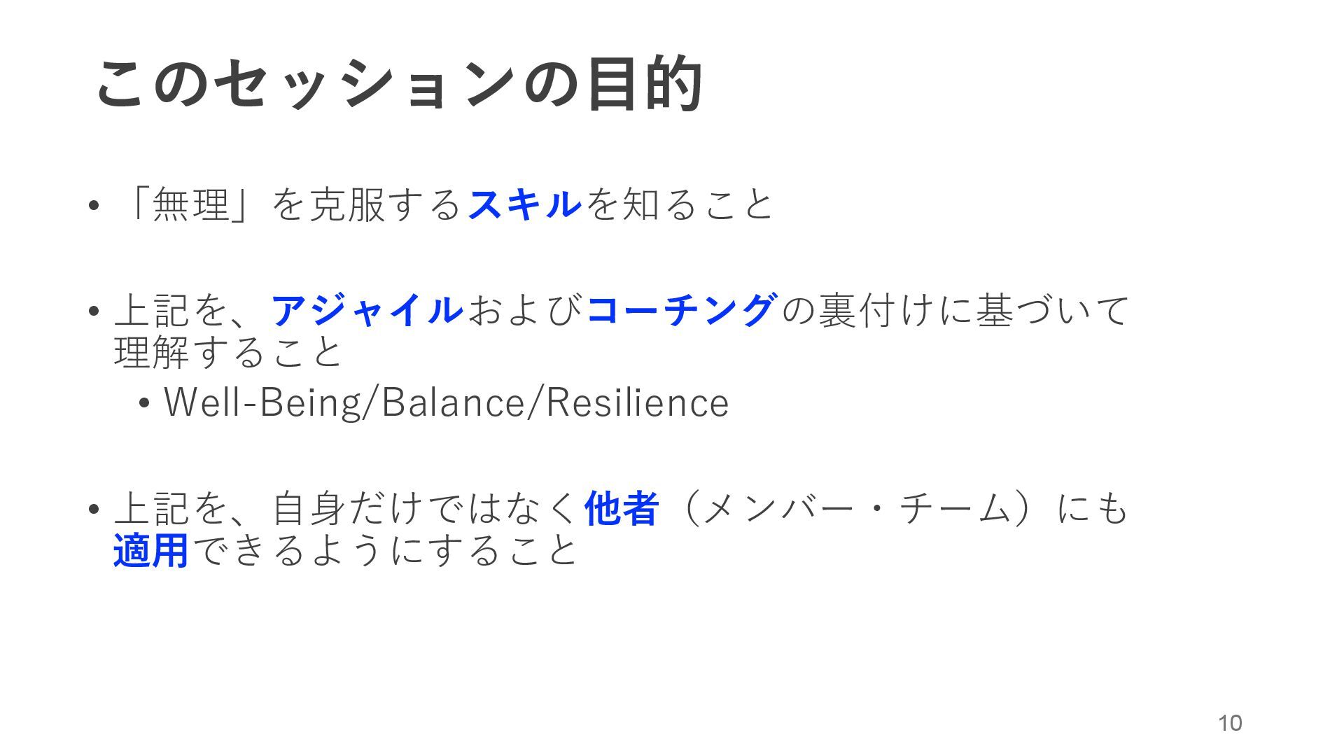 併せて、「無理」の気付き方、その減らし方、および心身の回復方法を、アジャイルおよびコーチングの観点から、実践的かつ再現性ある「スキル」として紹介・説明しています。