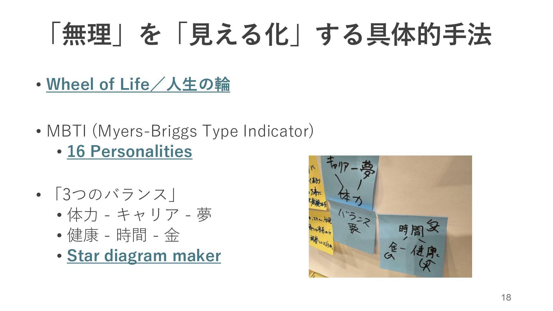 2. 「無理」を「見える化」する具体的手法 • Wheel of Life/人生の輪 • MBTI (Myers-Briggs Type Indicator)
