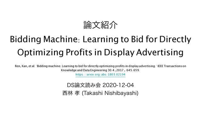 in Display Advertising Ren, Kan, et al. "Bidding machine: Learning to bid for directly optimizing profits in display advertising." IEEE Transactions on Knowledge and Data Engineering 30.4 (2017): 645-659. https://arxiv.org/abs/1803.02194 %4จಡΈձ ྛ 5BLBTIJ/JTIJCBZBTIJ