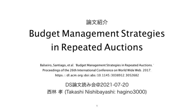 al. "Budget Management Strategies in Repeated Auctions." Proceedings of the 26th International Conference on World Wide Web. 2017. https://dl.acm.org/doi/abs/10.1145/3038912.3052682 %4จಡΈձ! ྛ 5BLBTIJ/JTIJCBZBTIJIBHJOP 1