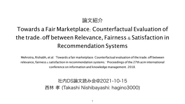Mehrotra, Rishabh, et al. "Towards a fair marketplace: Counterfactual evaluation of the trade-off between relevance, fairness & satisfaction in recommendation systems." Proceedings of the 27th acm international conference on information and knowledge management. 2018.
