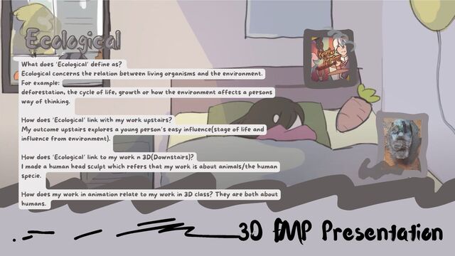 3D plan: sculpt, rabbit ear/rabbit My 3D outcome My 3D outcome I would like to get a plaster block as my base and work on my sculpt with clay. M a t e r i a l s : W a t e r , B u c k e t f o r w a t e r , C l a y , W o o d ( p r o b a b l y ) , Artists/Animators for inspiration: Frieren: Beyond Journey’s End the animation -> The flow in the movement influenced me. Frieren: Beyond Journey’s End the animation -> The flow in the movement influenced me.