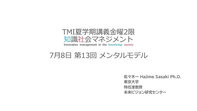 TMI夏学期講義⾦曜2限 知識社会マネジメント Innovation management in the knowledge society 7⽉8⽇ 第13回