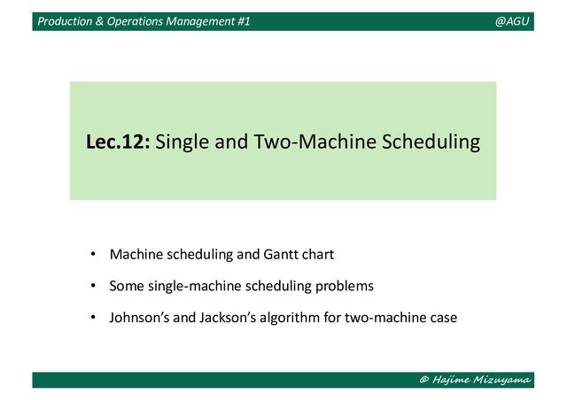 of different processing routes without recirculation. The jobs on each machine should be ordered to minimize the makespan. • Job set and machine set: 𝐽 = {1, 2, … , |𝐽|} and 𝑀 = {1, 2} • Processing time of 𝑘th (𝑘 ∈ {1, 2})) operation of job 𝑗 ∈ 𝐽: 𝑝!4 • Processing route of job 𝑗 ∈ 𝐽: 𝜇! = 𝜇!# , 𝜇!$ ∈ { 1, 2 , 2, 1 } • Job sequence on machine 𝑚 ∈ 𝑀: 𝜋- = (𝜋-# , 𝜋-$ , … , 𝜋- " ) • Starting time of operation (𝑗, 𝑘): 𝑆!4 • Completion time of operation (𝑗, 𝑘): 𝐶!4 • Makespan: 𝐶%&' = max !,4 ∈"×{#,$} 𝐶!4 Two-Machine Job Shop Scheduling Problem