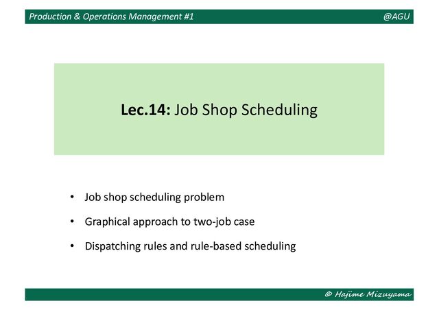 different processing routes. The jobs on each machine should be ordered to minimize the makespan. • Job set and machine set: 𝐽 = {1, 2, … , |𝐽|} and 𝑀 = {1, 2, … , |𝑀|} • Set of operations of job 𝑗 ∈ 𝐽: 𝐾! " = { 𝑗, 1 , 𝑗, 2 , … , (𝑗, |𝐾! "|)} • Processing time of operation (𝑗, 𝑘) ∈ 𝐾! ": 𝑝!# • Machine carrying out operation (𝑗, 𝑘) ∈ 𝐾! " : 𝜇!# ∈ 𝑀 • Set of operations on machine 𝑚 ∈ 𝑀: (𝑗, 𝑘) 𝜇!# = 𝑚} ≡ 𝐾$ % • Operation sequence on machine 𝑚 ∈ 𝑀: 𝜋$ = (𝜋$& , 𝜋$' , … , 𝜋$ (! " ) • Starting and completion times of operation (𝑗, 𝑘) ∈ 𝐾! ": 𝑆!# and 𝐶!# • Makespan: 𝐶)*+ = max (!,#)∈(# $ 𝐶!# Job Shop Scheduling Problem