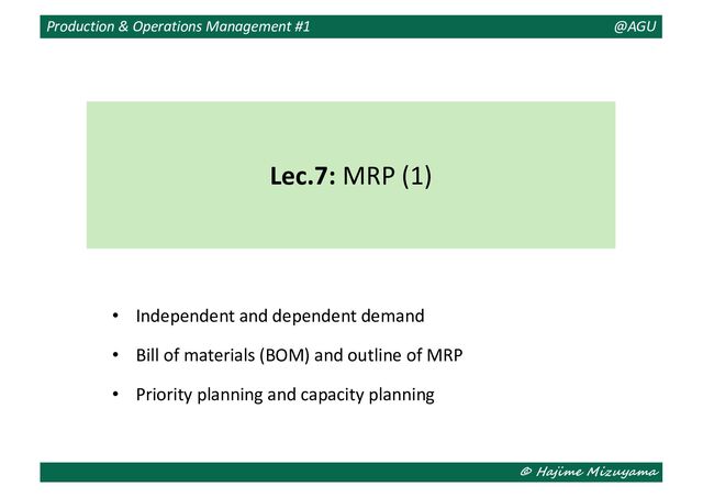 1. © Hajime Mizuyama Production & Operations Management #1 @AGU Lec.7: