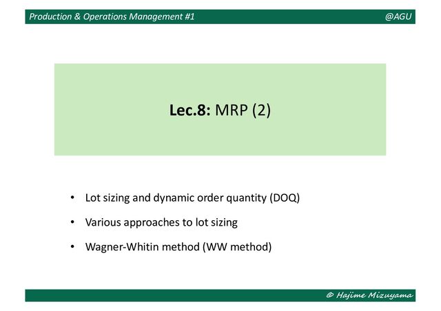 0.2 ⇒ F(n) Lot formation P(3) 290 A + F(4) = 390 A + hD4 + F(5) = 90 + 56 + 240 = 386 ⇒ F(3) (3,4) (5,7) A + hD4 + 2hD5 + F(7) = 396 (8) A + hD4 + 2hD5 + 4hD7 P(2) 120 A + F(3) = 476 A + hD3 + F(4) = 90 + 58 + 300 = 448 ⇒ F(2) (2,3) (4,5) A + hD3 + 2hD4 (7,8) P(1) 160 A + F(2) = 538 A + hD2 + F(3) = 90 + 24 + 386 = 500 ⇒ F(1) (1,2) (3,4) A + hD2 + 2hD3 (5,7) (8) Illustrative Example: Procedure of WW Method #2 X(3) = (1, 0, 1, 0, 0, 1) X(2) = (1, 0, 1, 0, 0, 1, 0) X(1) = (1, 0, 1, 0, 1, 0, 0, 1)