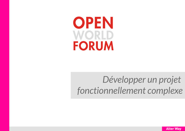 Les projets fonctionnels les plus riches sont aussi les plus coûteux : coûteux à maintenir, souvent décourageants face au changement, long à stabiliser... Ces retours d'expériences présentent quelques solutions à mettre en place pour faciliter le développement de projets informatiques riches et complexes, tant sur la méthodologie de travail (agilité...), la démarche de communication (développement piloté par le comportement) ou l'approche générale (Domain driven design) d'un projet. Seront présentés également les implémentations techniques et les outils Open Source à mettre en œuvre pour implémenter ces solutions, en précisant leurs avantages et leurs limites dans des cas pratiques.