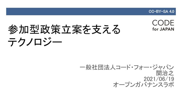 一般社団法人コード・フォー・ジャパン 関治之 2021/06/19 オープンガバナンスラボ 参加型政策立案を支える テクノロジー CC-BY-SA 4.0
