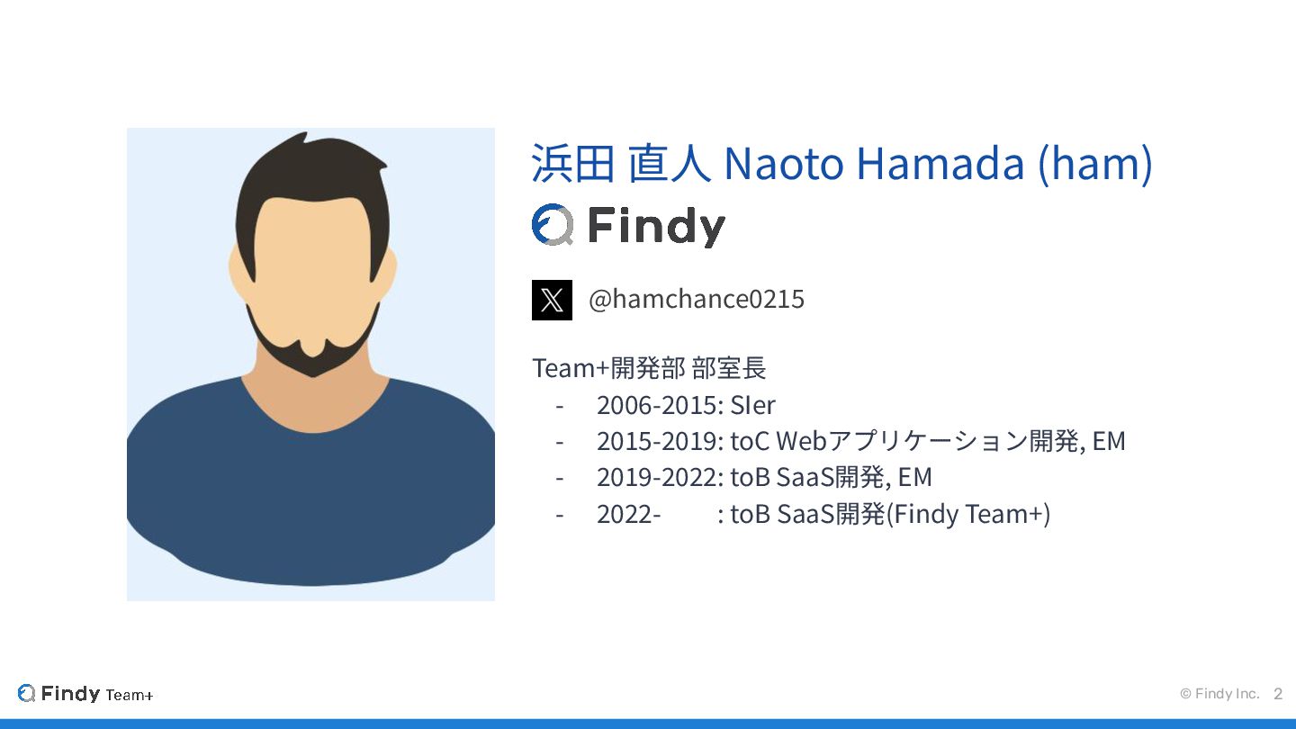 2015-2019: toC Webアプリケーション開発, EM - 2019-2022: toB SaaS開発, EM - 2022- : toB SaaS開発(Findy Team+) 浜⽥ 直⼈ Naoto Hamada (ham) @hamchance0215
