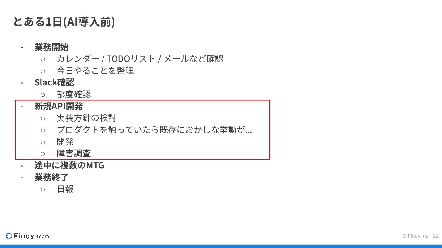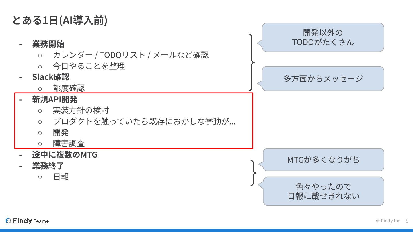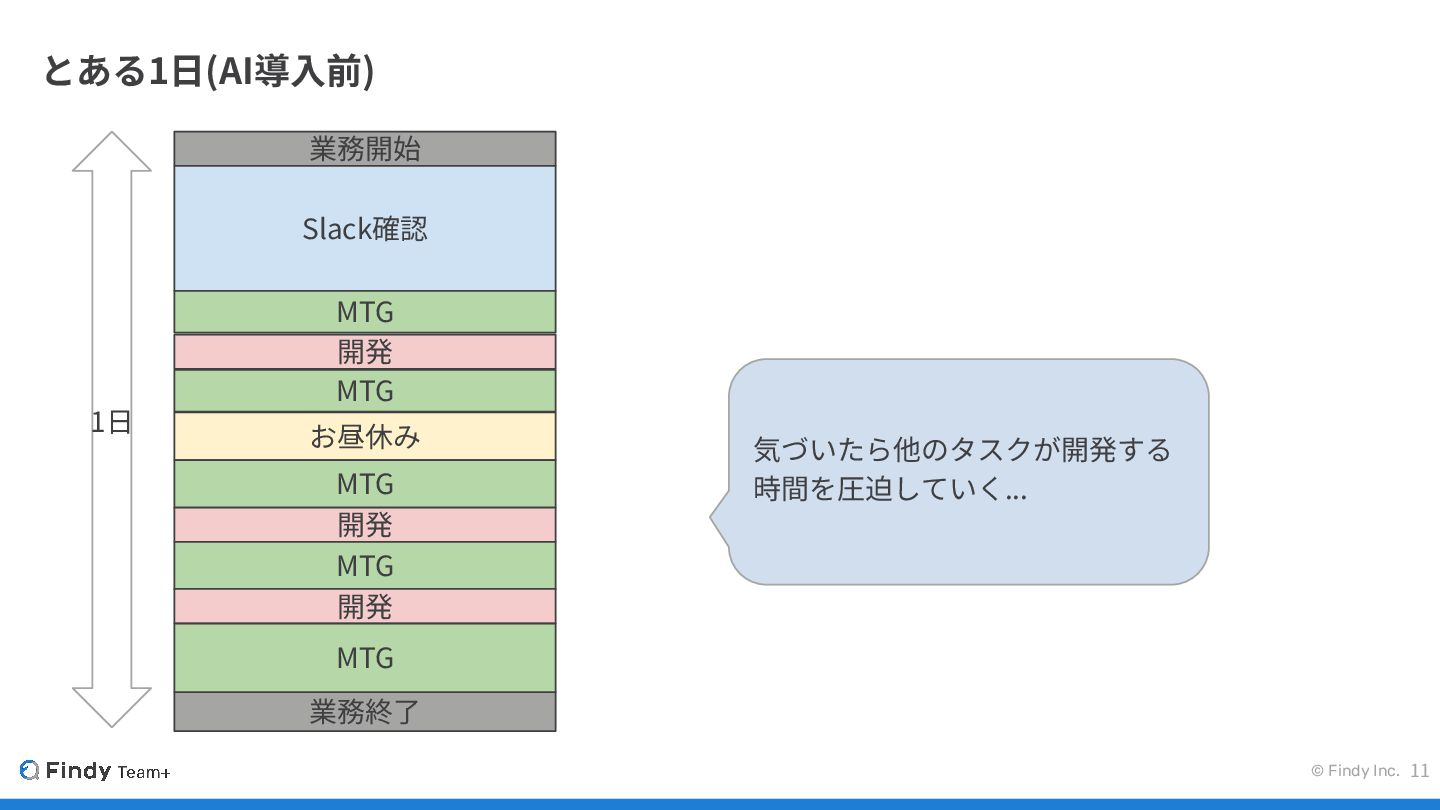 © Findy Inc. 10 とある1⽇(AI導⼊前) 業務開始 1⽇ Slack確認 MTG お昼休み