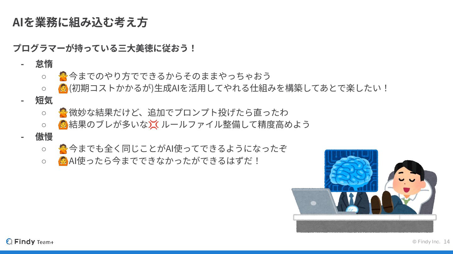 © Findy Inc. 14 AIを業務に組み込む考え⽅ プログラマーが持っている三⼤美徳に従おう! - 怠惰 ◦ 🙅今までのやり⽅でできるからそのままやっちゃおう